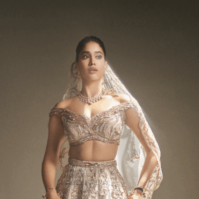 Ananya Panday looks absolutely breathtaking in this blush Tarun Tahiliani lehenga. Romantic in feel with a string of pearl droplets and a low back, we think a blouse like this is perfect for brides who subscribe to more low-key aesthetics. From the subtle plunge on the back to the expertly crafted work and sequin work at the hem on the band, it’s true perfection.