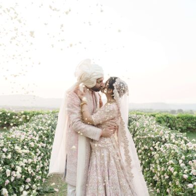 The couple beautifully infused their Indian-German cultures for the two wedding ceremonies. “For the church wedding, we did a few German traditions like cutting the log, releasing the doves, cutting a heart shape on a white banner and passing through. The Indian wedding on January 4 started with a baraat. We also had a varmala ceremony followed by pheras.” Blush colours were chosen for the theme to match the beach wedding vibe. The grooms wore sherwanis designed by Falguni Shane Peacock. A sangeet party after the ceremony concluded the celebrations.