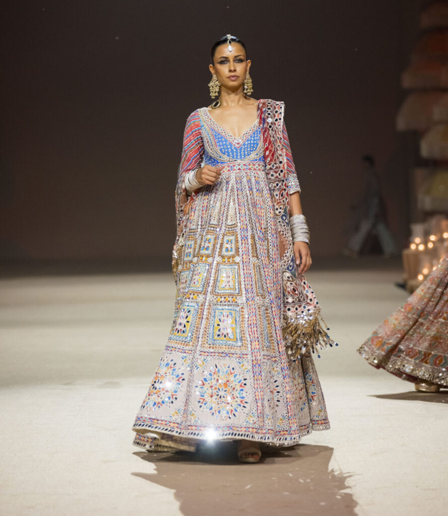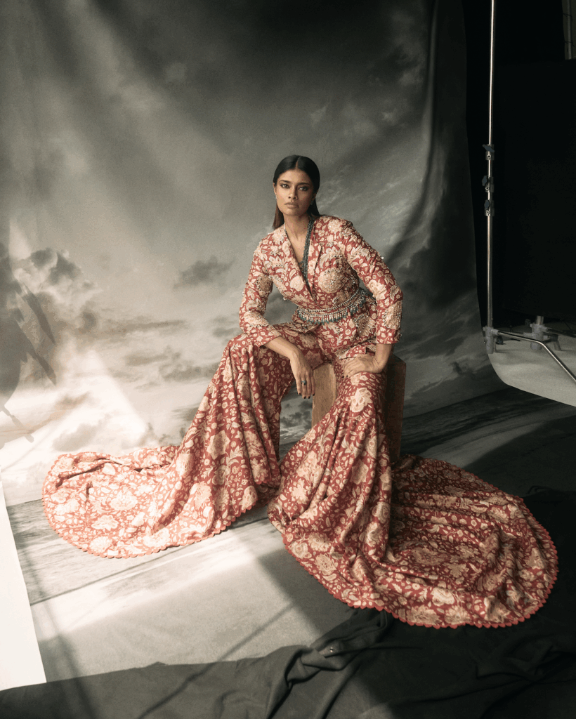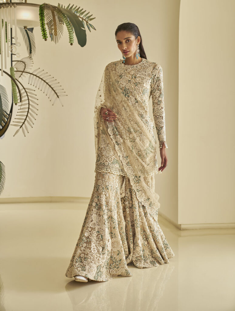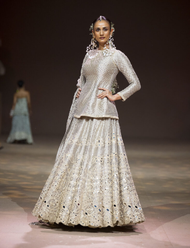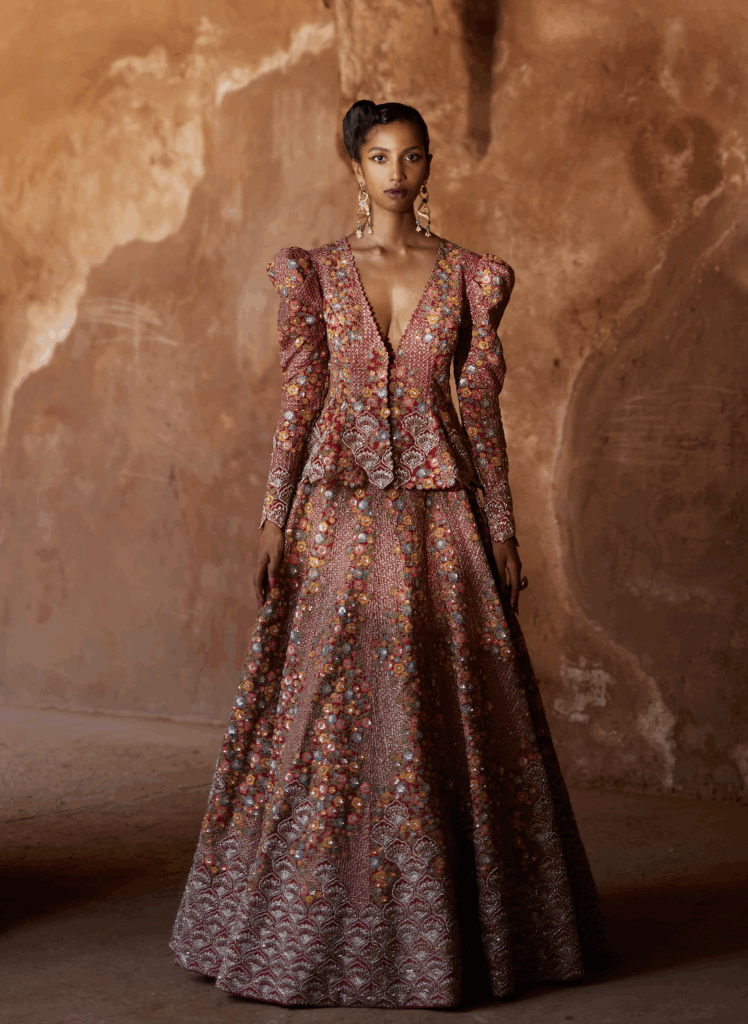 The easiest way to withstand cold temperatures, wind and snow is full-sleeved outfits. Want to hark the Medieval Era? Consider exaggerated bell sleeves or the Bishop style, both add drama and movement. Long, fitted sleeves are show-stopping option that exude modern minimalism and versatility. From classic blouse with a lehenga to ethereal anarkali, there is an abundance of long-sleeve choices of silhouettes for every style and body type. Beyond warmth, full sleeves also offer full coverage for those who prefer modesty or favour a dramatic and regal bridal look. For added practicality, detachable sleeves make a clever addition, allowing you to adapt your look from ceremony to celebration seamlessly. Abhinav Mishra’s latest couture outing, The Shrine is replete with several options.
