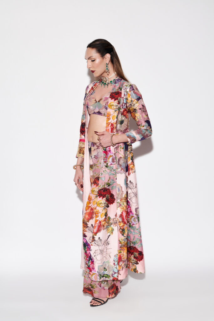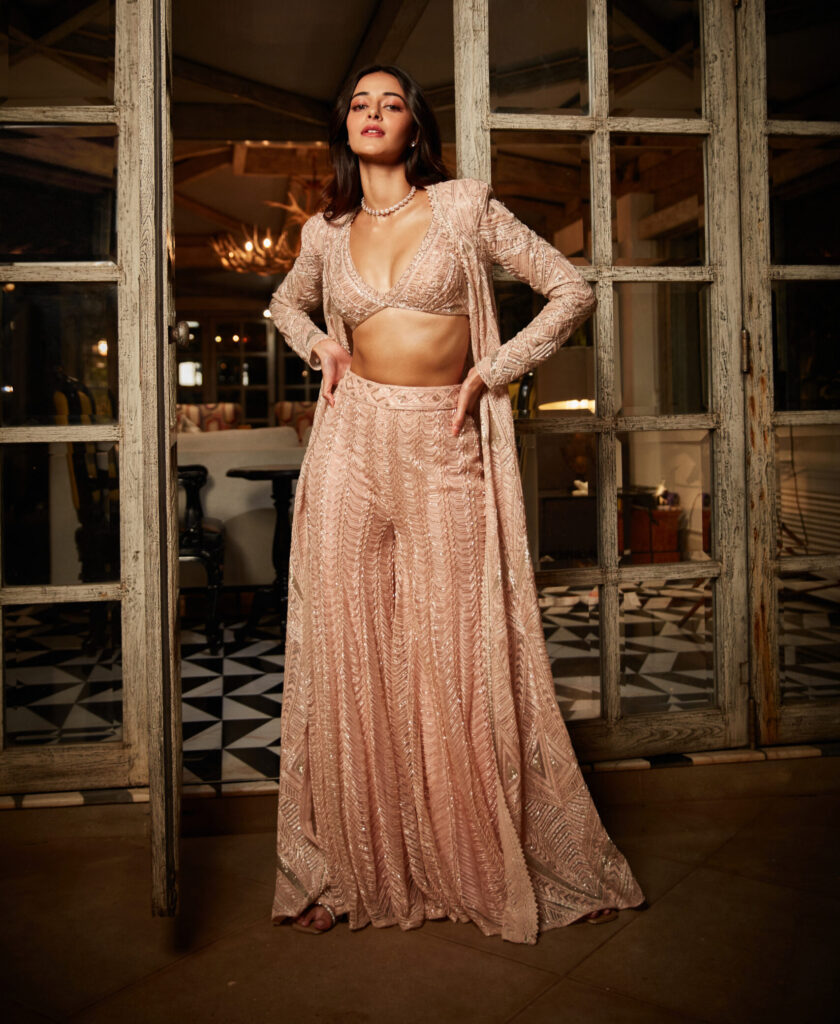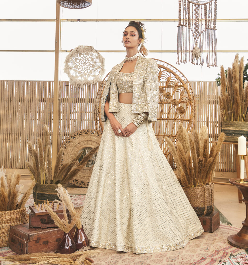 A popular choice with celebrities, JJ Valaya’s Alika is a biker-meets-bolero hybrid that’s distinguished by its meticulous construction, refined workmanship and collarless silhouette. SVA By Sonam & Paras Modi gorgeous ivory lehenga is complemented with an equally extravagant Noor jacket that’s emblazoned with beads and sequins. Ritika Mirchandani gives an ultra-feminine twist with this floor-length cover-up seen on Ananya Panday. Pair your jacket with jeans for a brunch or layer it over a cocktail gown.