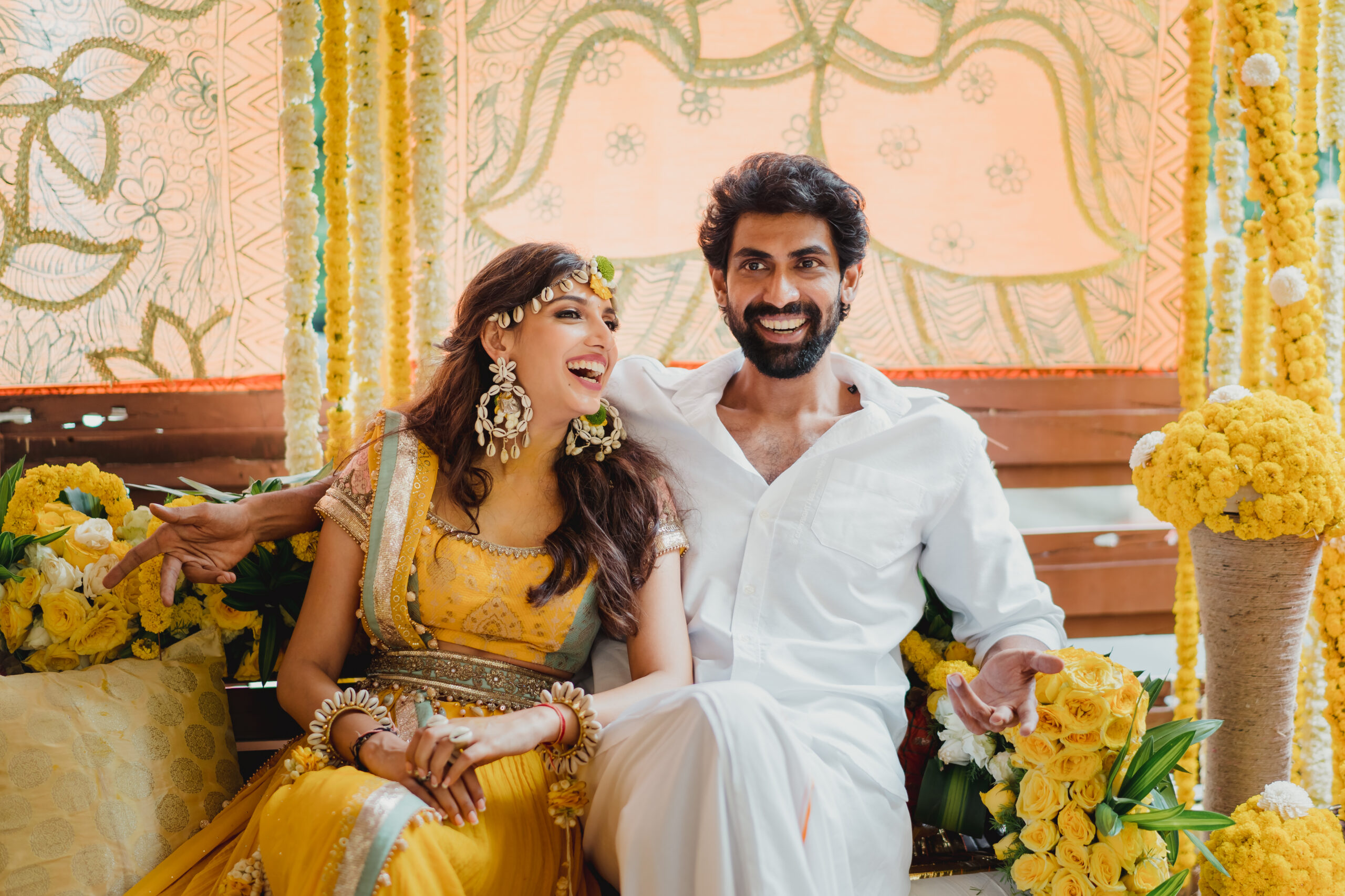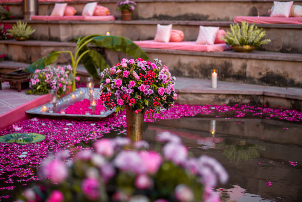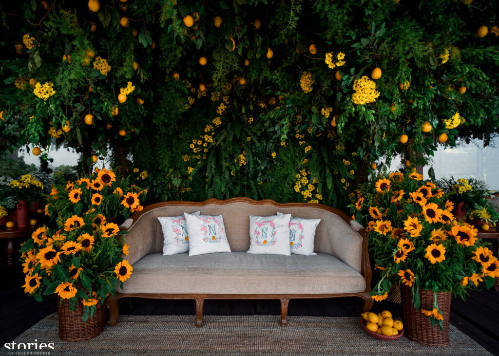 Saffron, lemon and sunflower… yellow and all its sunshine-inducing glory has been a surefire theme for pre-wedding celebrations. Associated with warmth and considered auspicious, this cheerful colour story promises to bring a bright, playful flair to your setting. Whether it’s a grand mandap draped in cascading flowers or a minimal installation framed by a breathtaking landscape, let flowers be your starting and focal point. Go for marigold, rose, lotus and hibiscus for a classic look, while blooms like lily, tulip and carnation make for contemporary choices.