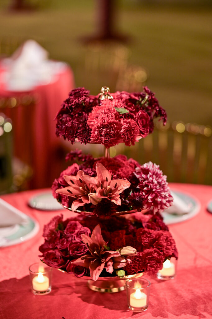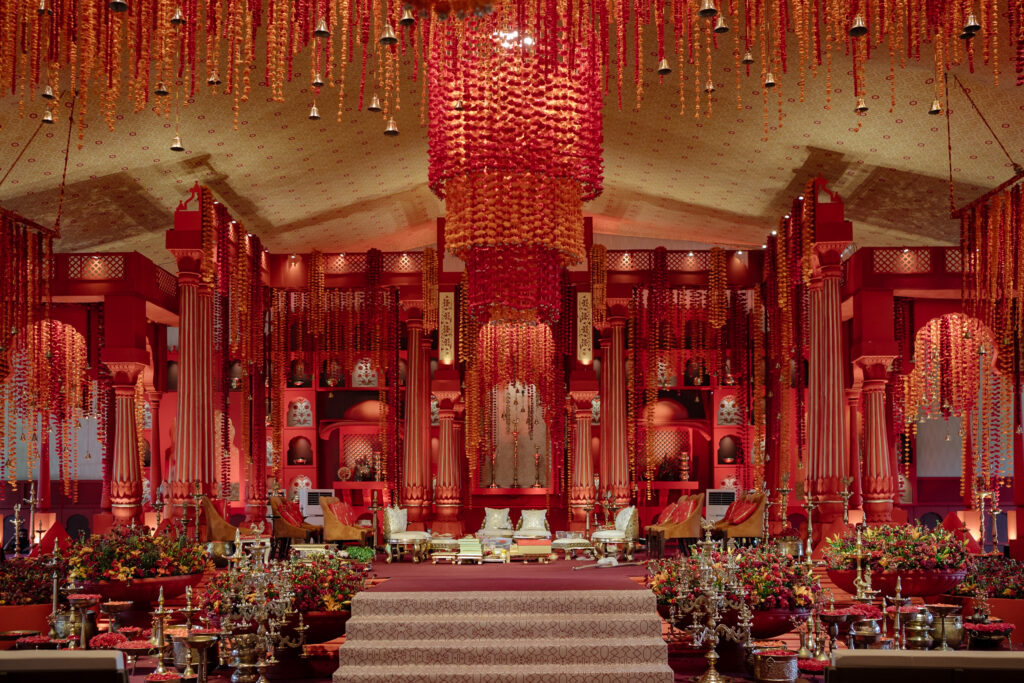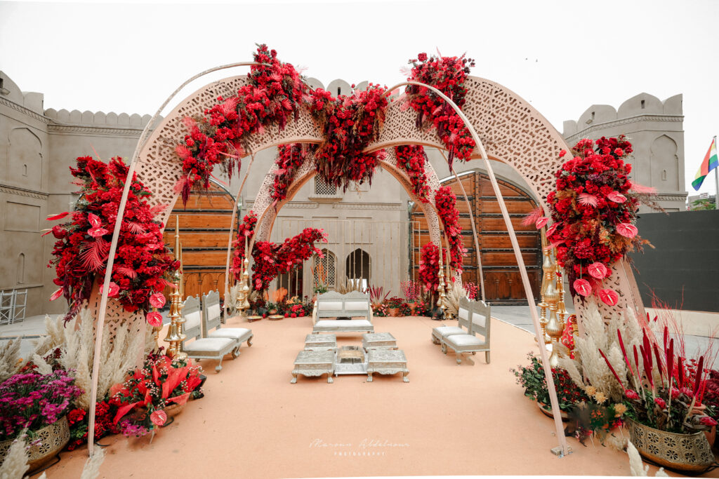 Entrance way to mandap, splash the setting with red across various aspects. The shade is already dazzling on its own, but when combined with patterns and prints, it takes on a whole new level of visual intrigue. Accompany your walk down the aisle with geometric rugs or clash red linens as soft furnishings. There are far more ways to make an impression with crimson than your decorations. Consider a menu crafted with ingredients in this naturally occurring rich tone. Use red-toned lighting to create a romantic ambiance or incorporate red lanterns and accents.