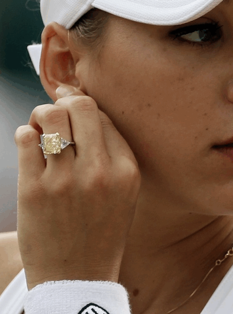 Tennis star Anna Kournikova’s engagement ring from longtime partner Enrique Iglesias is the stuff of legend. Valued at $5.4 million when first gifted, the ring features a radiant-cut yellow diamond flanked by trillion-cut side stones, creating a bold yet elegant silhouette. Designed to dazzle from every angle, the diamond has reportedly appreciated to nearly $9 million today. Fun fact: Anna famously wore her massive ring even during tennis matches, proving that when you own one of the world’s most expensive engagement rings, normal jewellery rules simply don’t apply.
