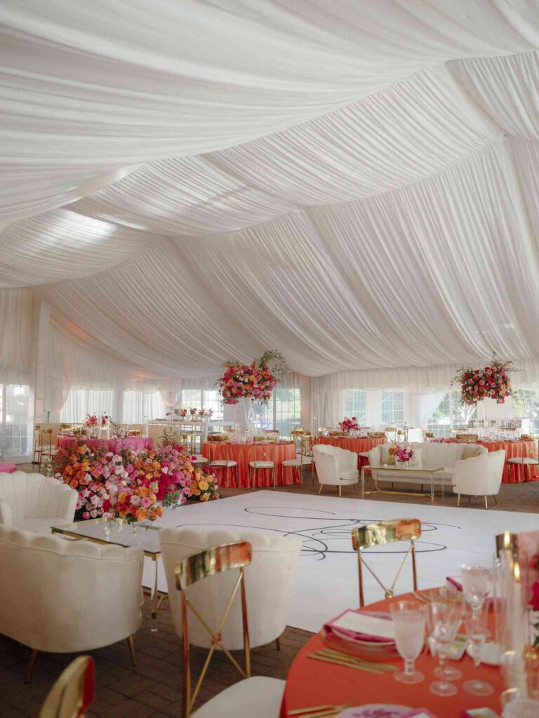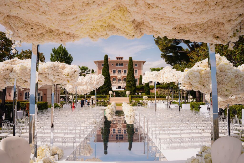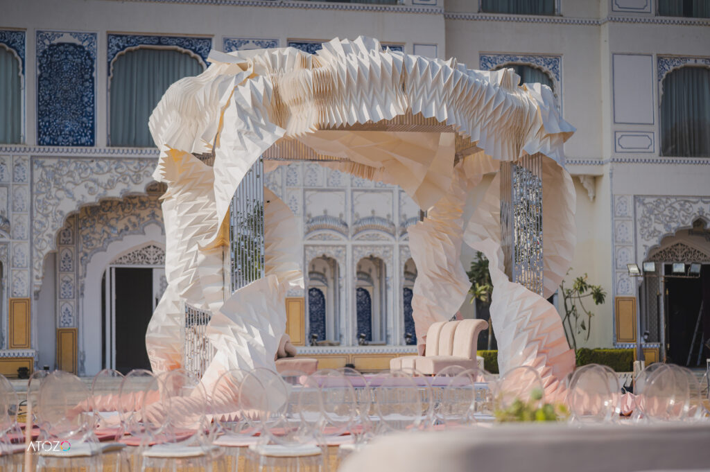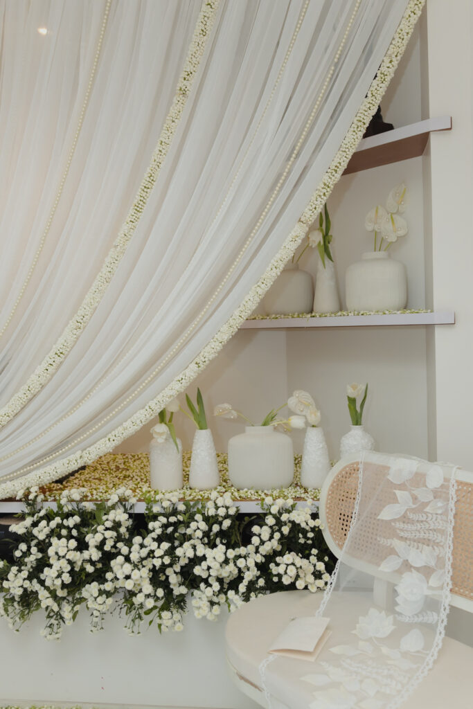 Using Cloud Dancer textiles across your venue is an easy way to create a clean, cohesive look. The shade works well in different fabrics, be flowing chiffons, rich organza or even monotone embroidered silks. Consider simple draping ideas like a soft ceiling canopy for the ceremony, fabric-lined walkways for guest movement or clean pleated backdrops for stages and photo areas. These practical textile touches help carry the colour seamlessly through the celebration.
