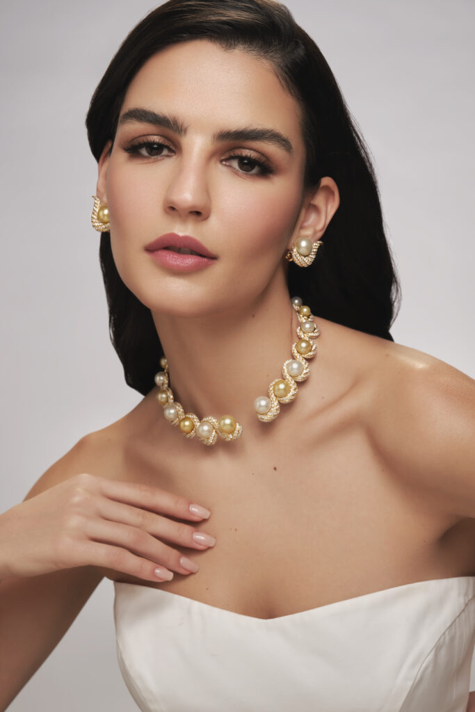 Jewellery with touches of Cloud Dancer tones looks just as exquisite as yellow gold. Think pearls, polki, diamonds and even gemstones with soft ivory undertones. The palette will sit beautifully against a bridal outfit in any shade, be it sindoori red or blush pink. Mixing and match with other heirloom pieces in different shades to create a signature jewellery look.