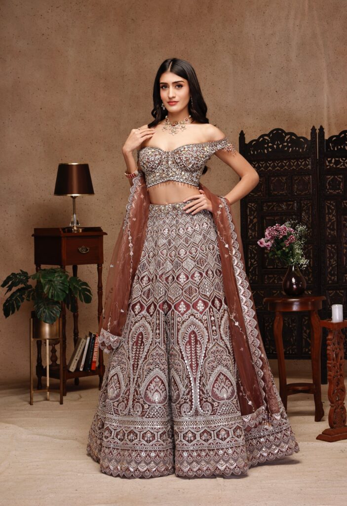 This rich chocolate-toned lehenga feels tailor-made for a winter sangeet, with its warm, autumn-inspired palette. The off-shoulder blouse, universally flattering and very sensual, is drenched in intricate embroidery. The matching skirt showcases ornate motifs. Finished with a sheer dupatta, it’s elegant, seasonally apt and effortlessly glamorous. Buy it HERE.