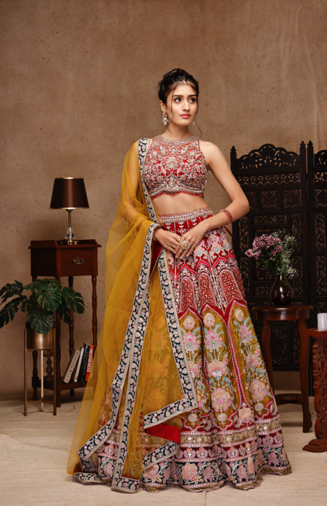 Blending vibrant reds with sunlit mustard and soft florals, this lehenga transitions effortlessly from a daytime ceremony to an evening celebration. The off-halter, back-open blouse is universally flattering, offering structure with a hint of allure. Ideal for the bride skipping red for the main ceremony, yet wanting a moment with the colour during her wedding festivities. Buy it HERE.