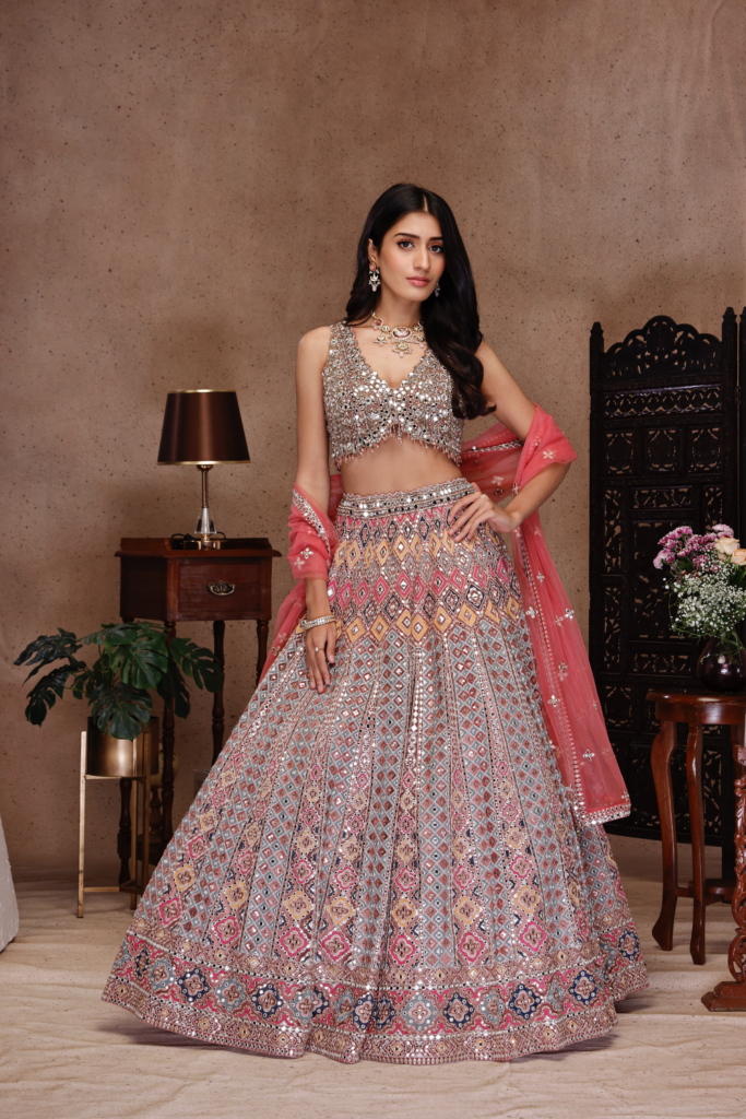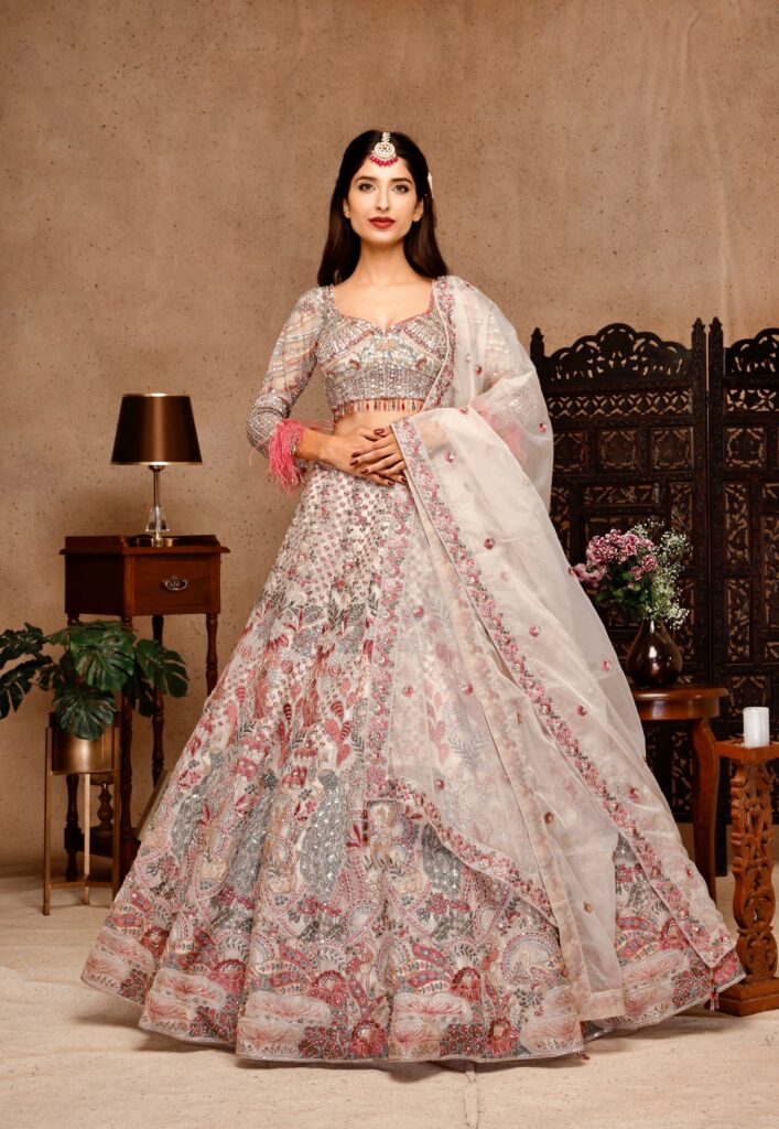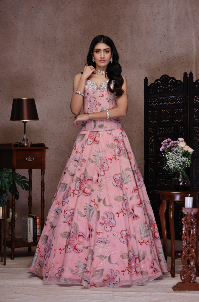 Who said florals are groundbreaking only in the day? Soft blush tones meet romance in this embroidered lehenga set, teamed with a structured corset blouse that defines the waist. Delicate floral motifs bloom across the skirt in pastel threads and subtle sheen, and the matching dupatta adds lightness. It is perfect for a bride who wants femininity with a fashion-forward edge. Buy it HERE.