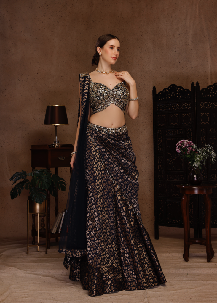 This noir lehenga leans bold and sultry, but it is crafted using classic brocade. It is paired with a sculpted, crystal-encrusted blouse with a fluid, gold-motif skirt. The deep neckline and cinched waist feel undeniably modern, while the ornate embroidery keeps it rooted in occasion wear—perfect for a bride who prefers drama over tradition on her cocktail night. Buy it HERE.