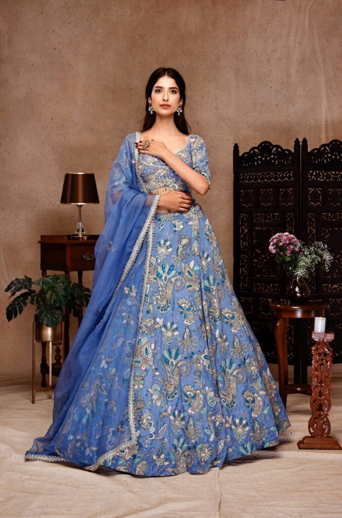 Drenched in a serene powder-blue hue, this lehenga balances old-world craft with modern polish. Golden embroidery and printed motifs ripple across the skirt, adding depth without overwhelming the palette. Paired with a softly embellished blouse and airy dupatta, it’s an elegant choice for brides who favour understated glamour. Buy it HERE.