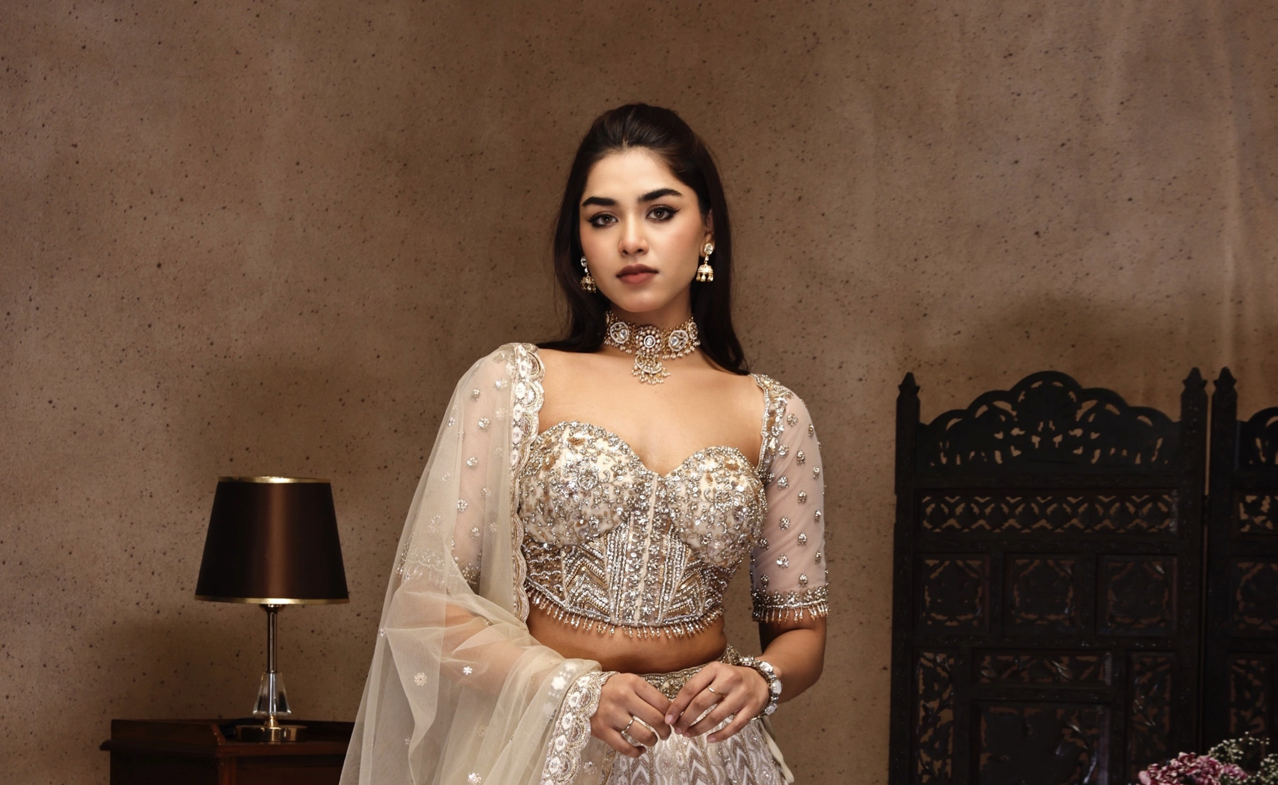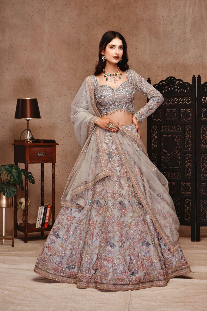 This mint-green lehenga stands out for its refreshing, unexpected palette that is soft yet striking. The fully embellished corset-style blouse, complete with sculpted seams and intricate crystal work, brings couture structure to the look. Paired with a richly embroidered skirt and sheer dupatta, it feels modern, romantic and quietly show-stealing. Buy it HERE.
