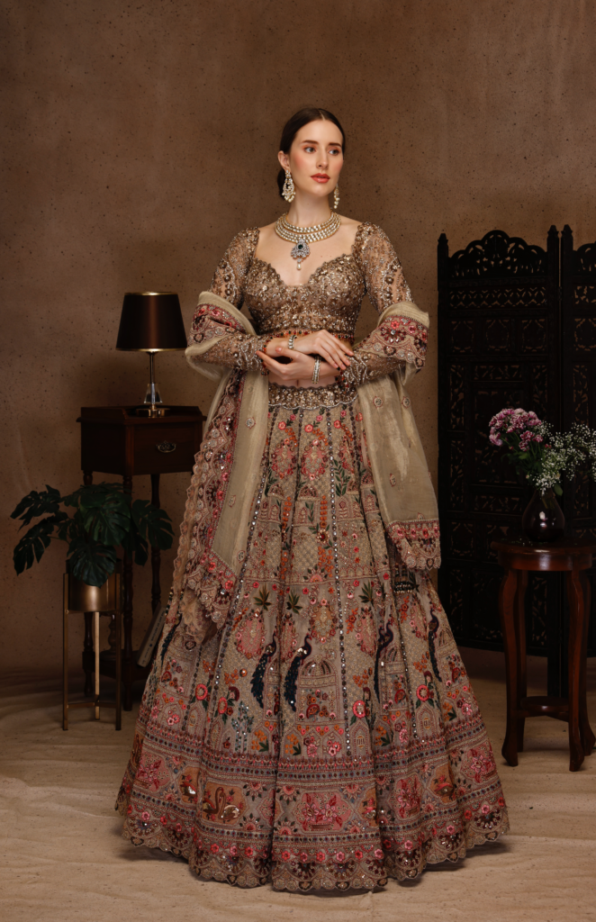 Rendered in an unexpected olive-gold hue, this lehenga feels refreshingly offbeat yet undeniably regal. Intricate floral embroidery intertwines with peacock motifs across the skirt, lending it depth and storytelling detail. Paired with a fully embellished full-sleeve blouse and a delicate tissue dupatta, it’s a statement choice for brides seeking colour beyond the conventional. Buy it HERE.