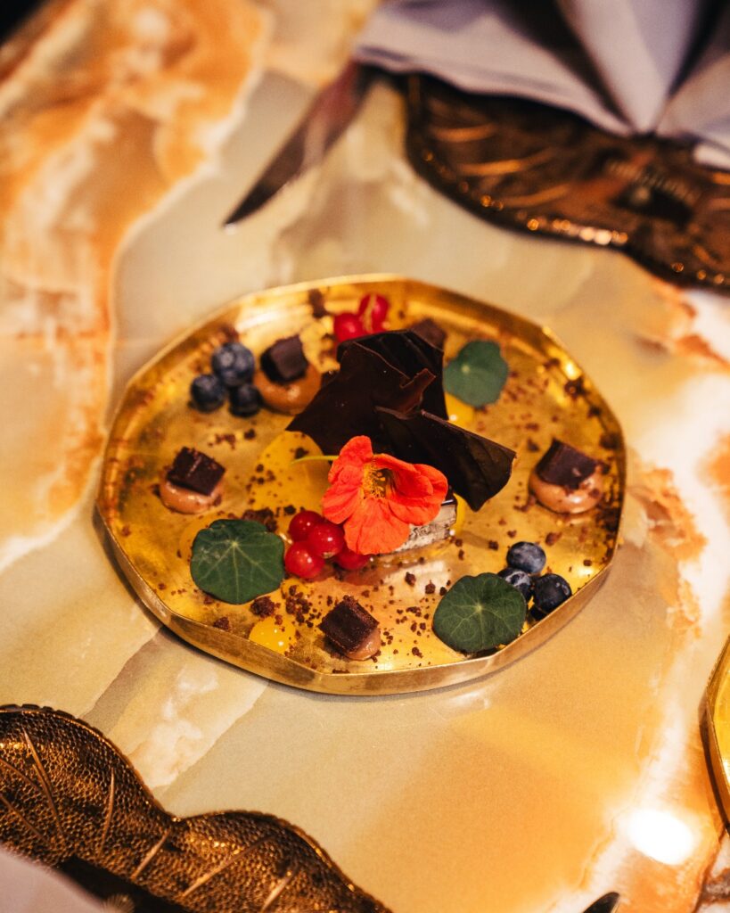 The central, posh and effortlessly accessible location only adds to the allure. Step in, and the ambience immediately sets the tone. The interiors are outfitted with sleek dark wood, polished marble, jewel-toned seating and a statement central bar. The design encourages socialising, whether you’re perched at the bar for cocktails or settling into a candlelit table for an indulgent meal.