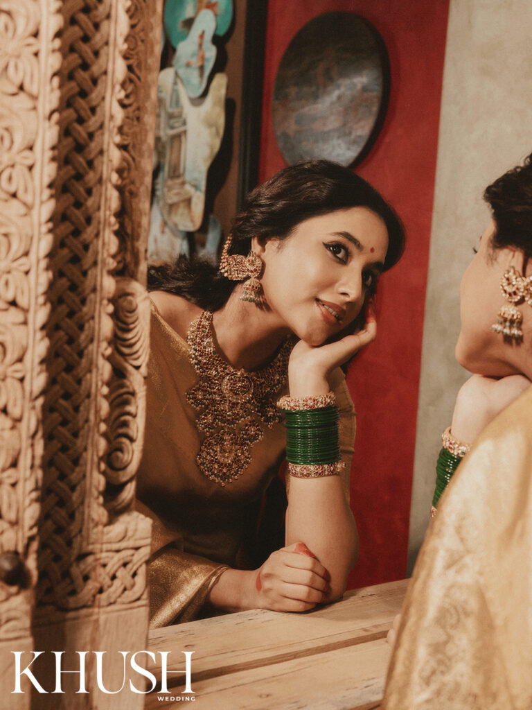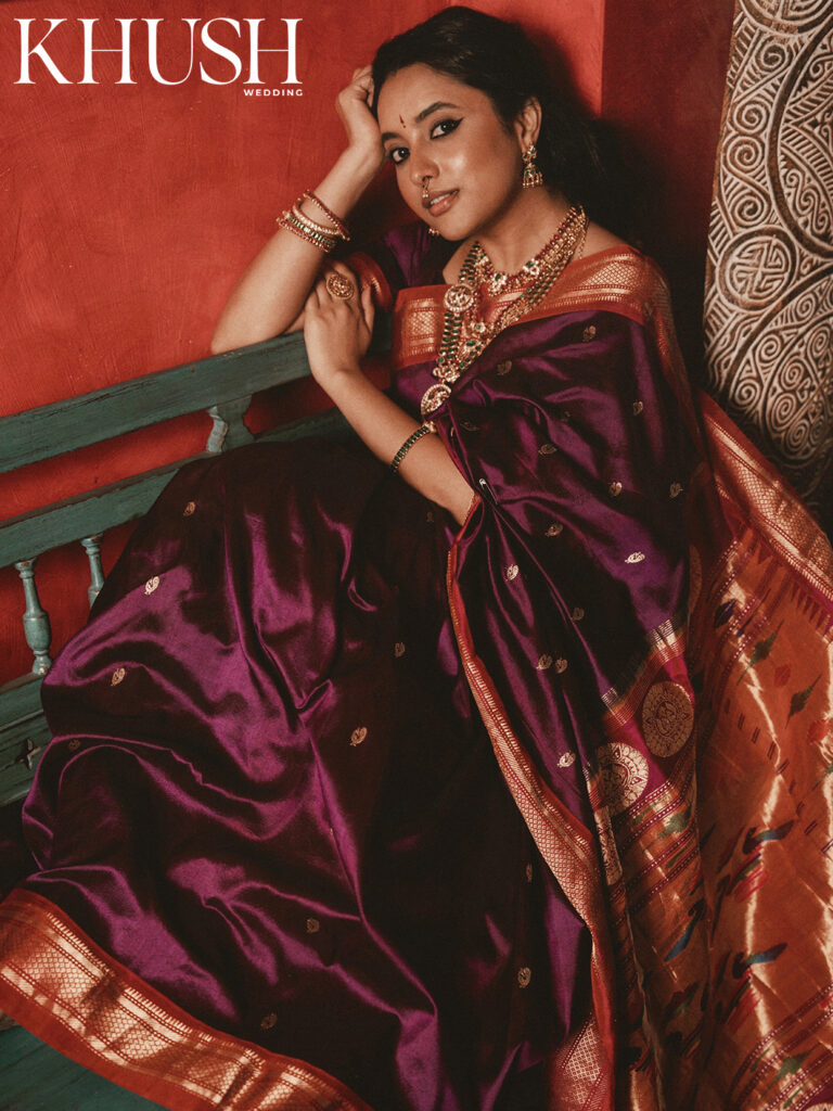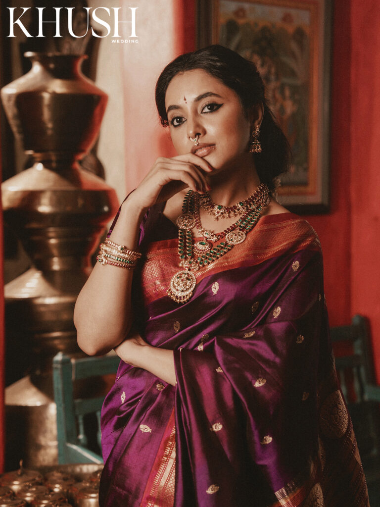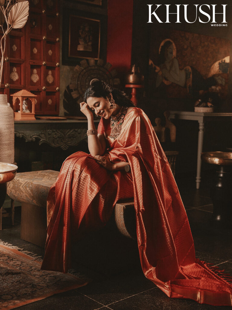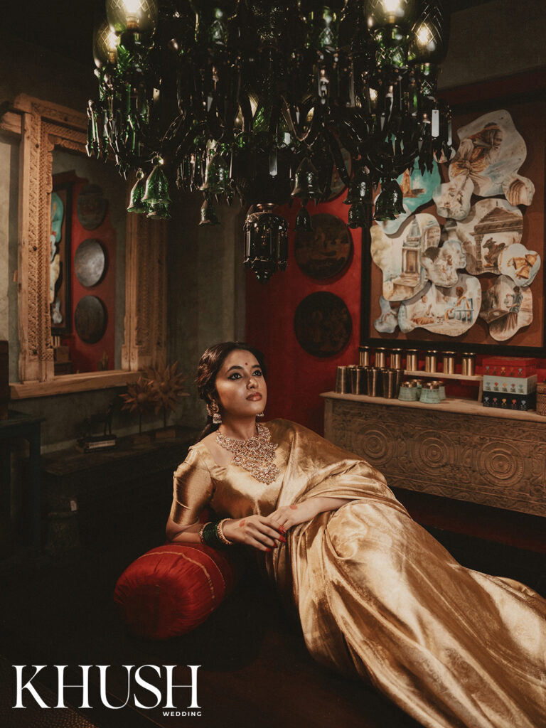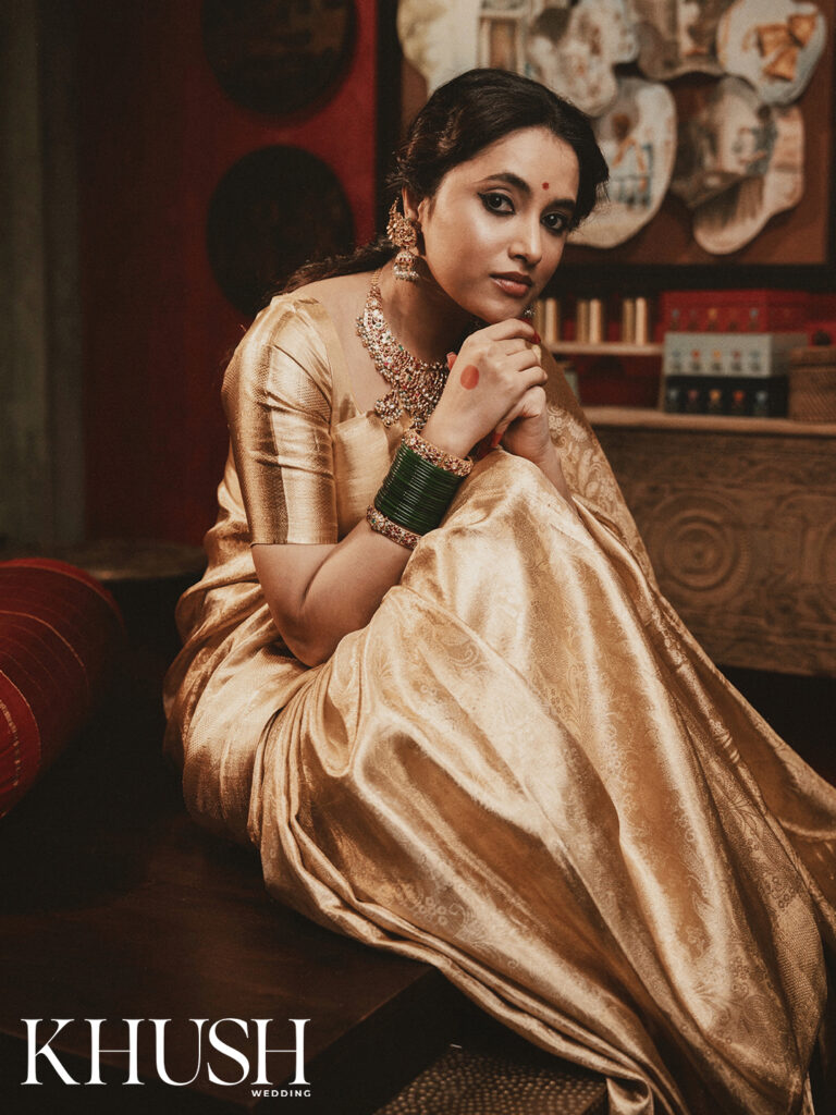 I met Priyanka Mohan for the first time at a fashion show in Hyderabad. She was dressed in a gold handwoven tissue sari, which seemed as if woven with sunlight and shimmering with heritage. Her presence felt almost regal, like a figure straight out of a Raja Ravi Varma painting that’s poised and graceful. That first impression stayed with me. And now, she turns muse for Khush Wedding’s cover shoot, draped in the most beautiful heritage weaves. Think Banarasi silk, rich brocades, glistening Chanderi six-yards and jewel-toned Paithanis that echo stories of palace corridors and classical frescoes.