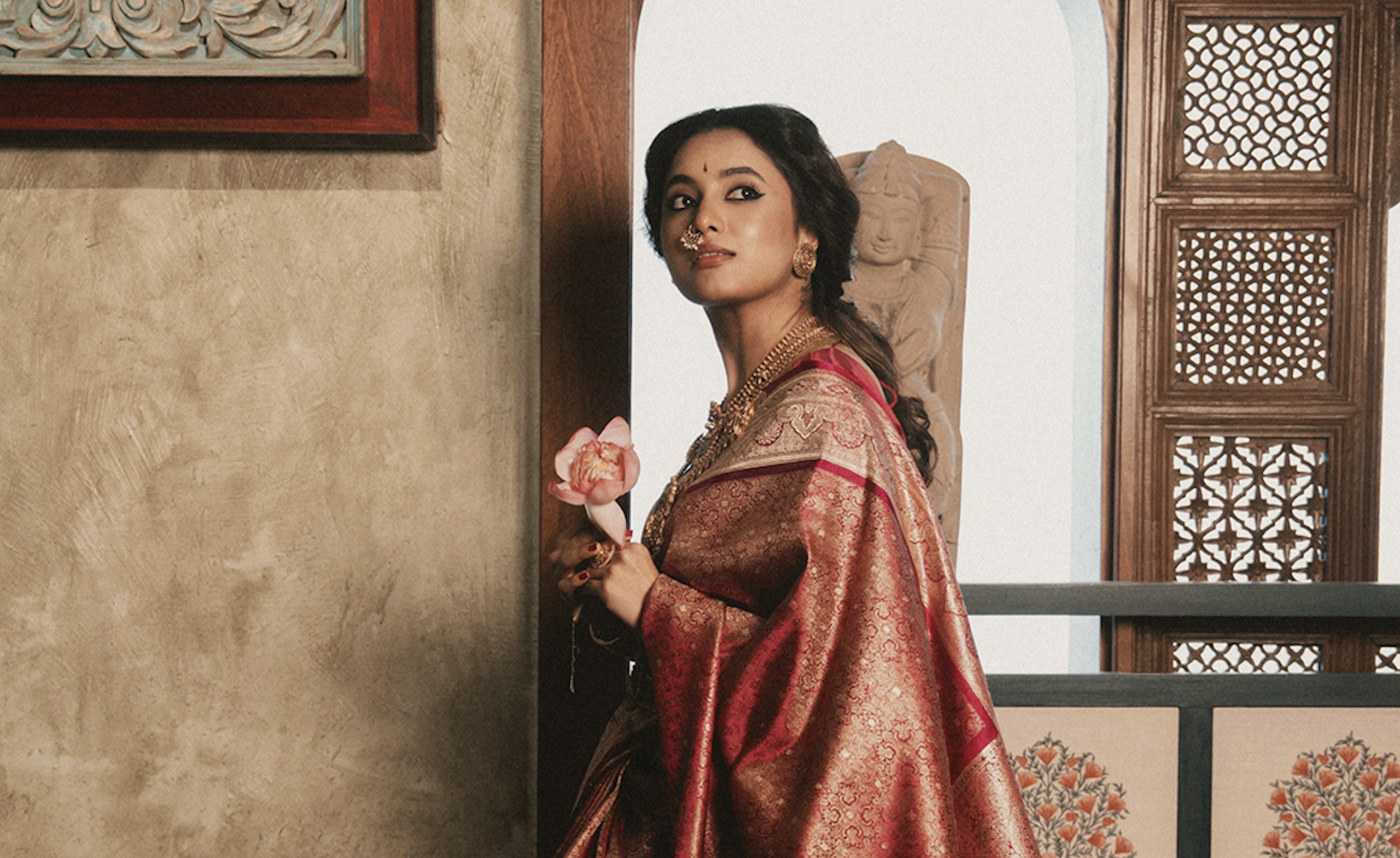In every frame, whether she is seated with a thoughtful gaze or caught mid-turn, Priyanka evokes erstwhile royalty, reminiscent of the queens seen in Mysore’s durbar portraits or the silent grace of temple sculptures. “I had a great time shooting with the Khush team. From the concept to the location, it felt like I was transported back in time,” she tells me. There’s an ease with which she inhabits traditional textiles: a deep maroon brocade feels less like a an heirloom passed down through time; a lush gold silk feels like a sun-warmed relic. She doesn’t just drape these saris, she embodies them. The result is an editorial shoot that feels timeless, relaying South India’s craft legacy and Priyanka’s own journey from contemporary cinema to classical elegance.