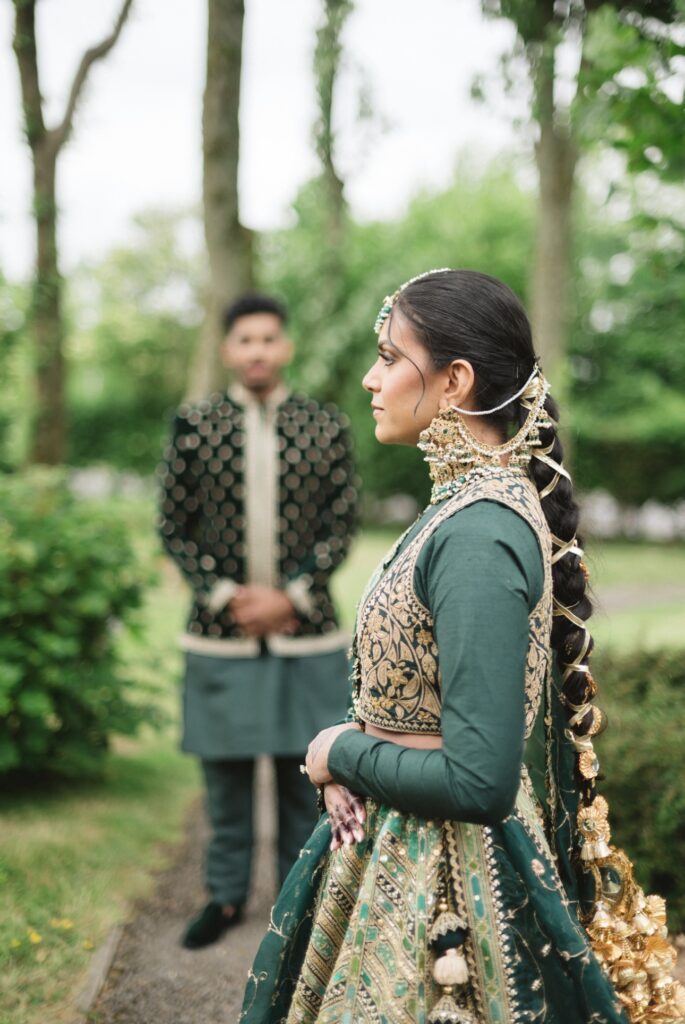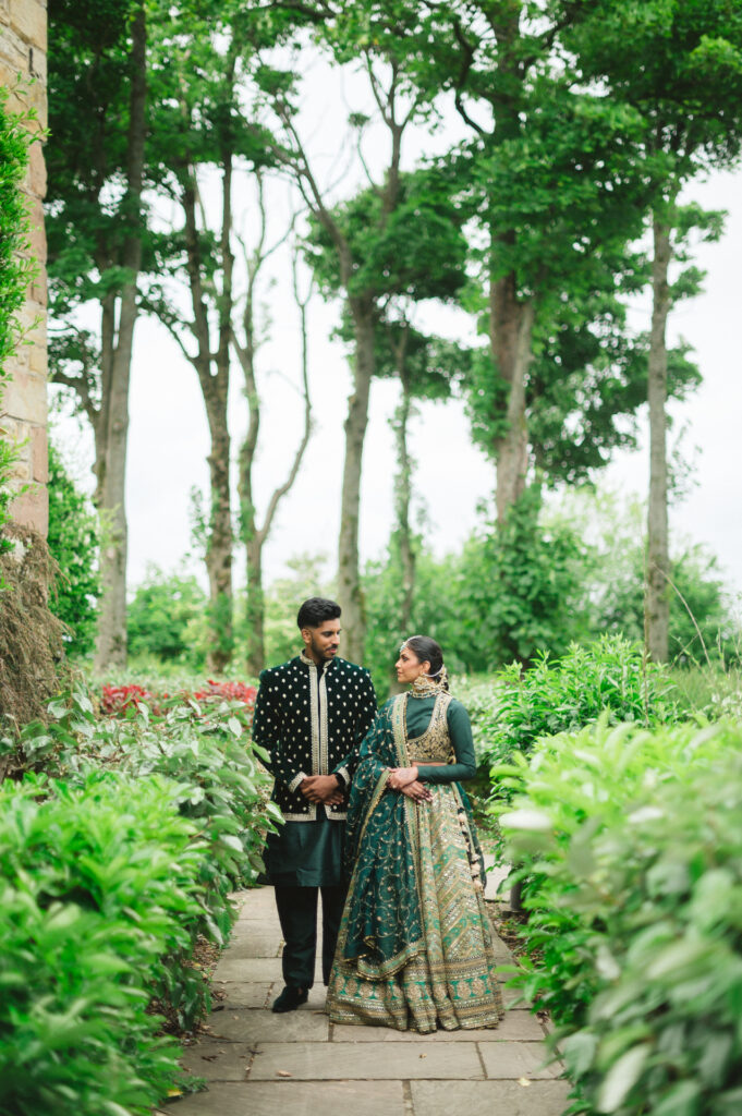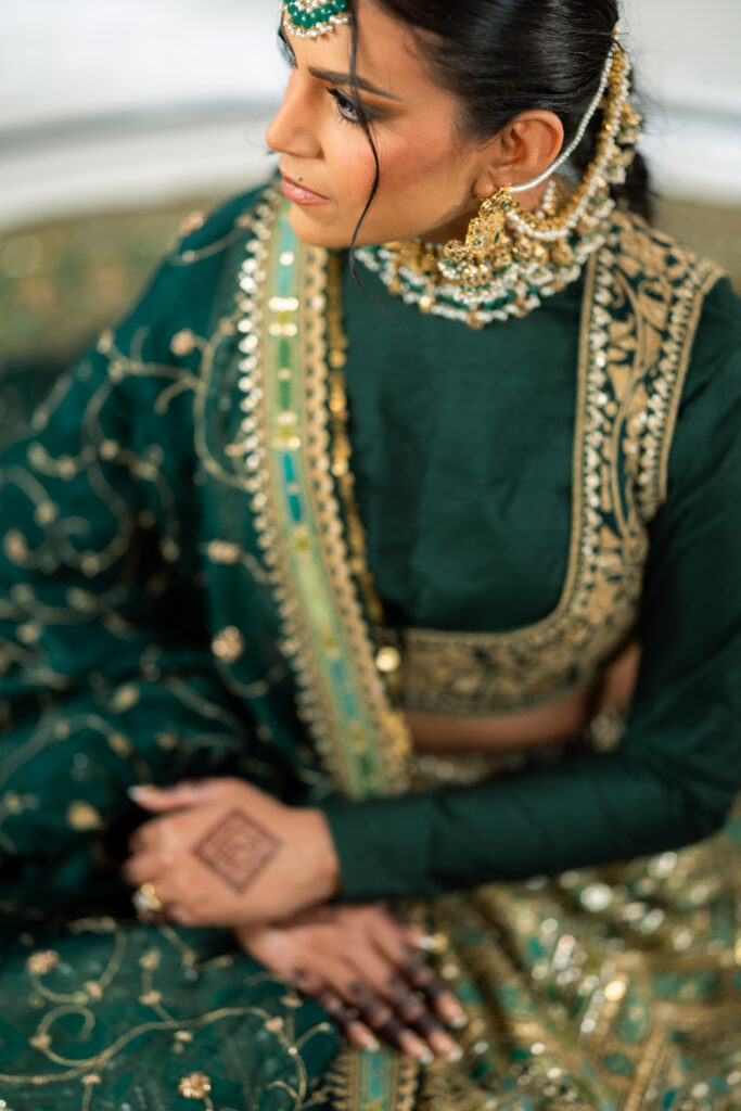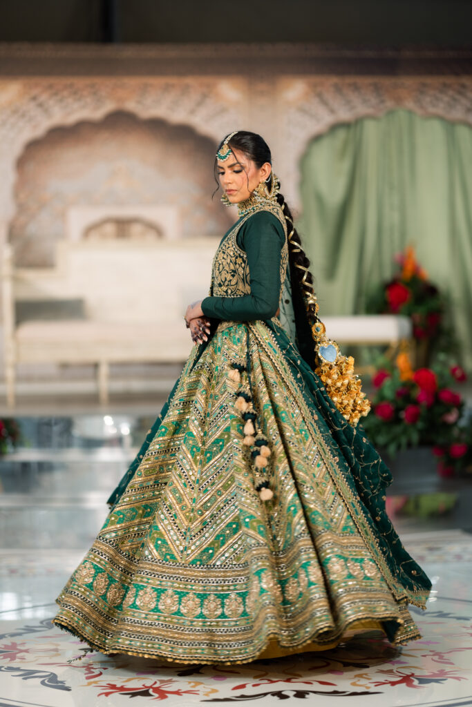 The chaddar held particular significance. “When my father walked in holding the gold tinsel chaddar he had made by hand, inspired by my parents’ wedding nearly 30 years ago, I felt something shift. It was the first time I truly felt the weight of the journey we were stepping into.” Rubab wore a green Sabyasachi lehenga from the couturier’s Heritage Collection, styled with a large gold paranda and jewellery from The Jewellery Trunk. Darren complemented her in a deep green velvet embellished jacket.