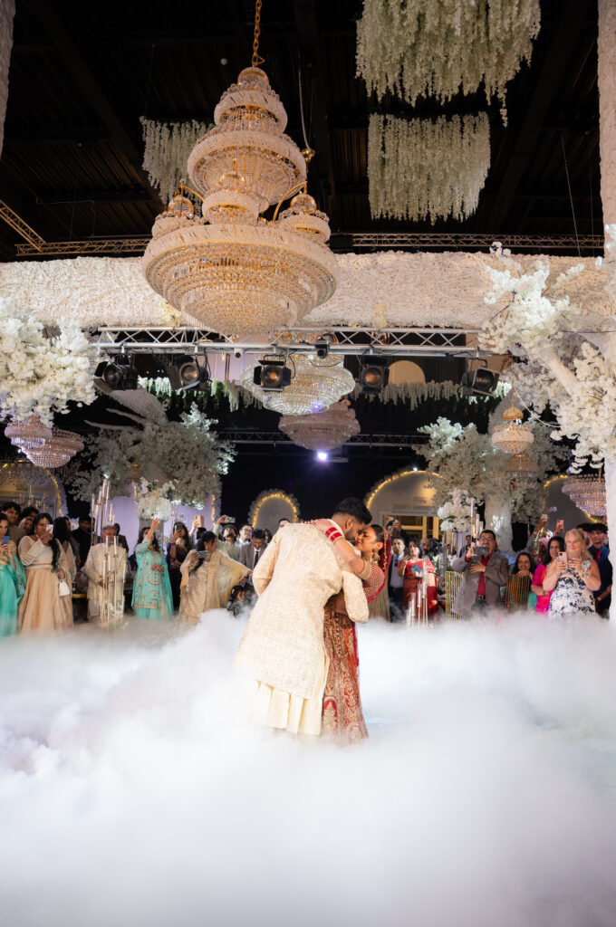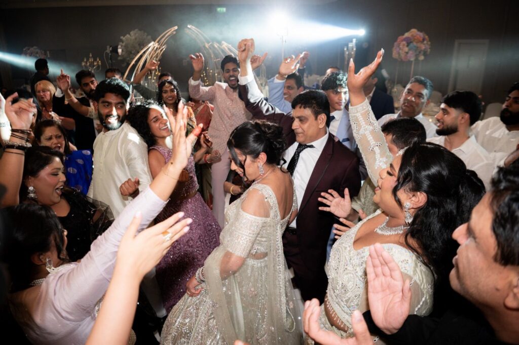 Post the church wedding on May 26 was the reception at Balmayna in Bolton. It was the grand finale. The venue was transformed with ornate staging, dramatic lighting, tall floral installations and rich textures. The evening flowed seamlessly from formal welcome through dinner and speeches, ending with traditional Punjabi rituals of the Joota Chupai and Rail Gaddi dance.
