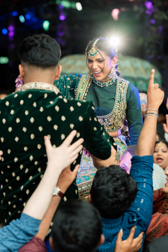 May 18 was the Ladies Sangeet, which created an intimate women-only space where generations came together. The most moving moments came when each woman offered advice for the chapter ahead, before Bollywood classics took over the dancefloor. “I’ll never forget the moment the music started and our friends, from all over the world, took the stage. Knowing they had rehearsed for weeks just for us was overwhelming in the best way.” Rubab wore a lime-green backless lehenga with sparkly eyes and green liner.