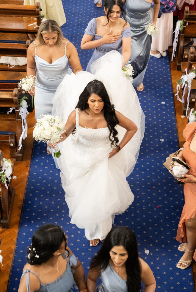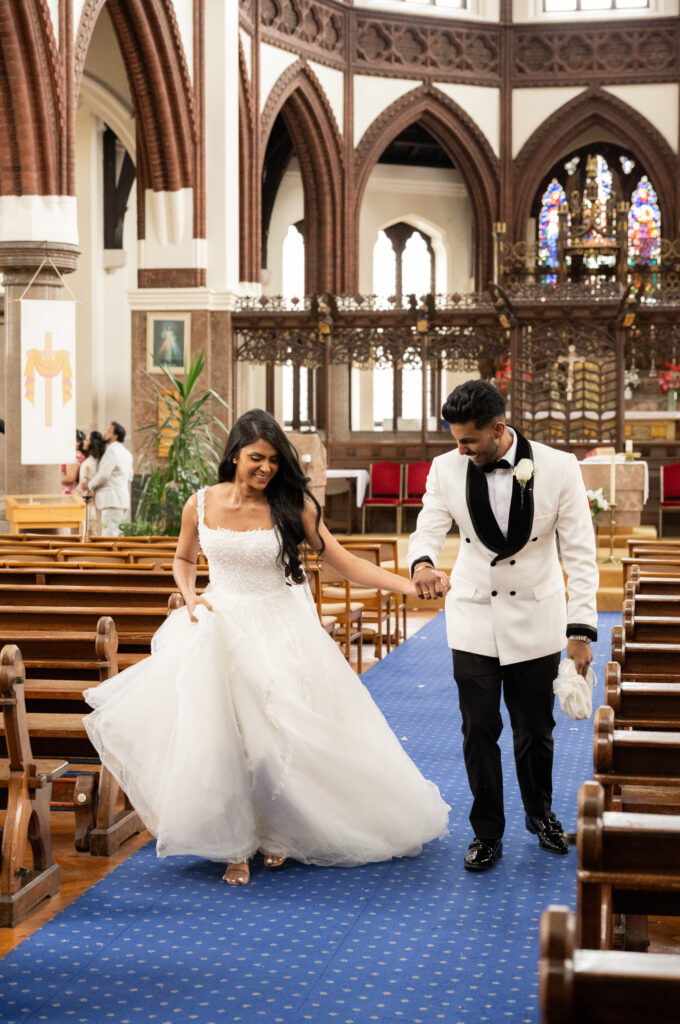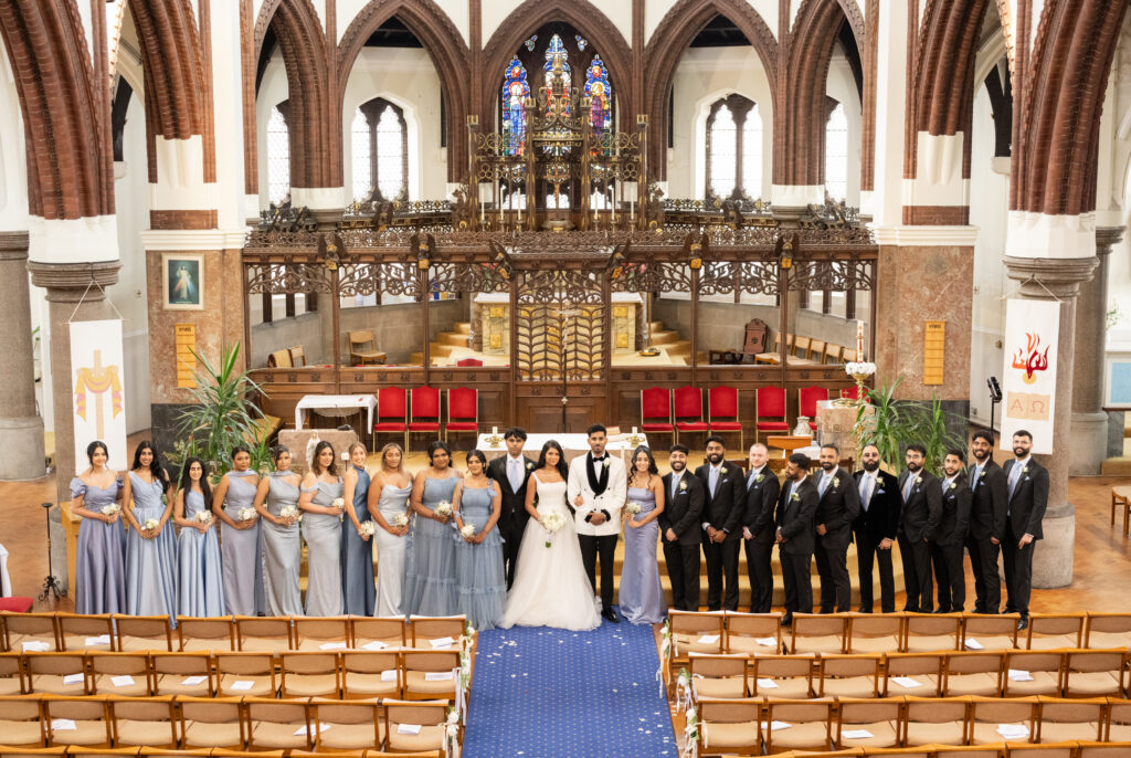 The white wedding at the Church of Our Lady and the Apostles in Stockport was deeply personal. “This was a non-negotiable choice for me; it is the church that shaped my faith,” Rubab explains. A violinist played handpicked processional music; ‘Jashn-e-Bahara’ from Jodhaa Akbar and ‘Ve Kamlaya’ from Rocky Aur Rani Kii Prem Kahani. The service was enriched by readings from Rubab’s brother and uncle, with vows exchanged featuring the Bible verse from their invitation cards.