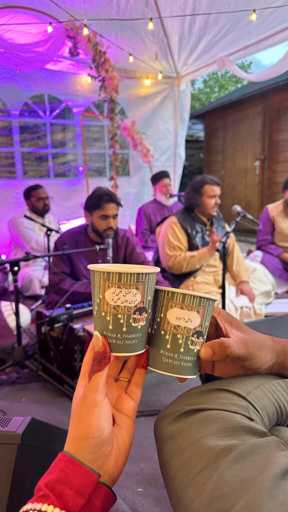 On May 3, the couple’s friends hosted a Qawwali Night in their garden as a wedding gift. Under a star-filled sky, a live Qawwali band filled the air with devotional Sufi music. Guests shared samosas and karak chai served in custom-printed cups. Rubab chose a deep red Hussain Rehar anarkali, while Darren wore a traditional suit layered under a jacket sourced from Lahore.