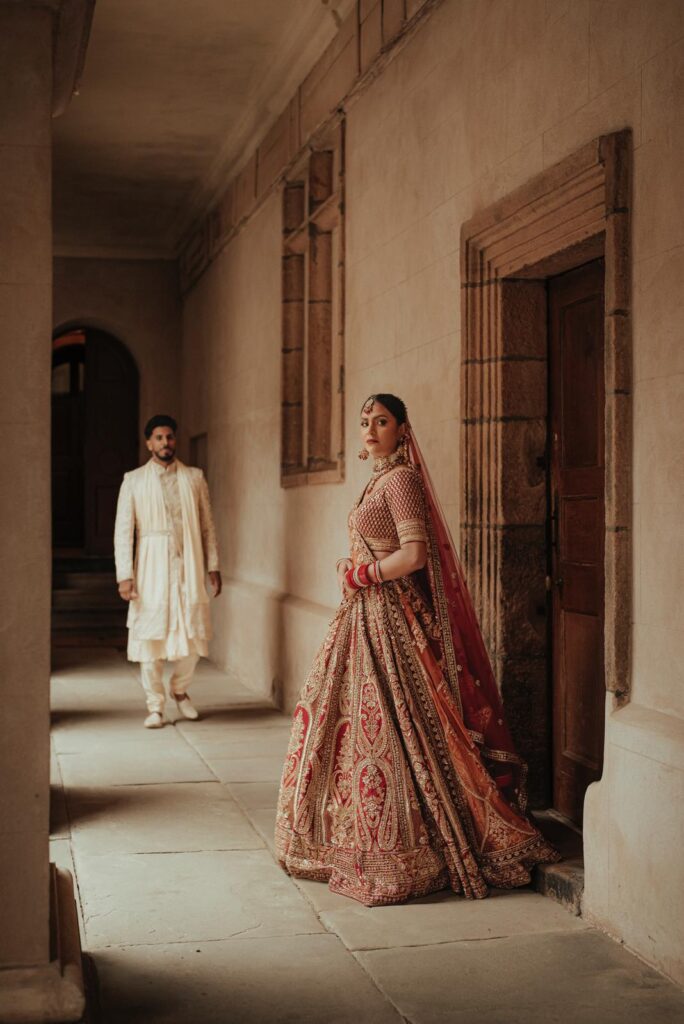 Rubab chose a red Sabyasachi lehenga paired with maroon jadau kundan jewellery in a regal Mughal aesthetic, completed with choora and kaleerey. Her makeup shifted to bold smoky eyes, defined contour and deep red lips with a structured bun. Darren wore a traditional beige sherwani with subtle embroidery.