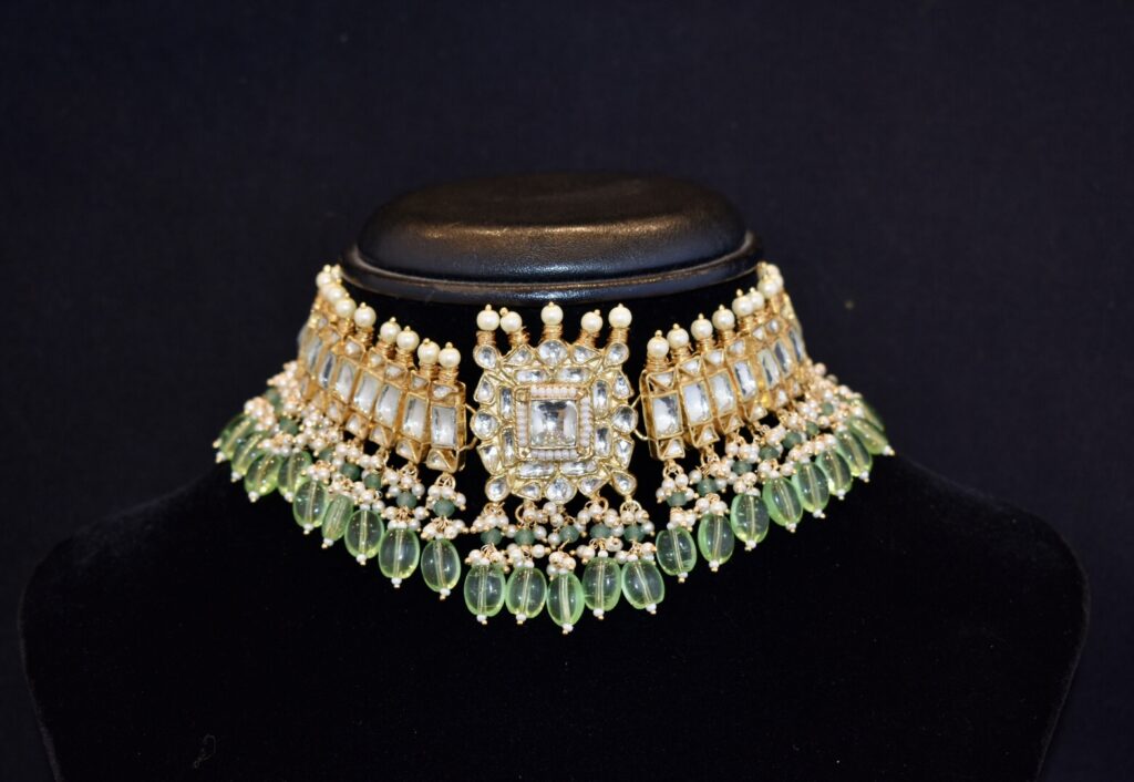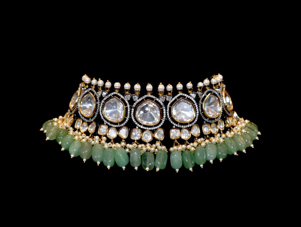 This one is designed for brides who believe bigger is better. This statement choker features oversized Victorian-style diamonds paired with soft semi-precious green stones. Bold yet refined, it is guaranteed to shine as a standalone hero piece. Let it lead your look, paired simply with classic chandbalis for a daytime event or studs for a glamorous sangeet party. Buy it HERE.