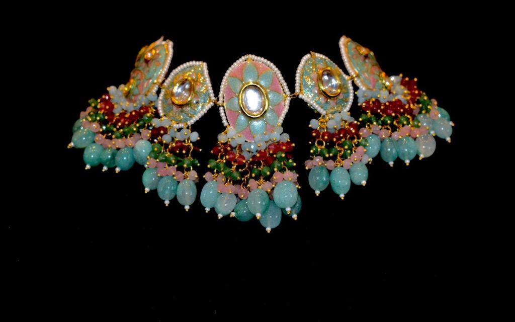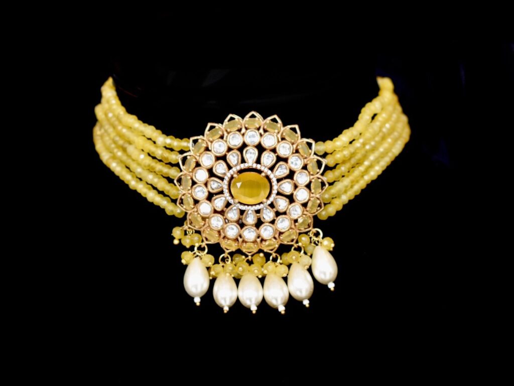 Bathed in a vibrant yellow hue, this choker is a natural fit for joyful pre-wedding moments like mehndi or haldi. Bright yet elegant, it balances tradition with versatility, making it a piece you’ll reach for long after the big day. Style it with a sharara or a sari for festive occasions like Diwali or Eid. The sunny tone pairs beautifully with emerald green, bold rani pink, or even a coordinated yellow ensemble for a spirited, celebratory look. Buy it HERE.