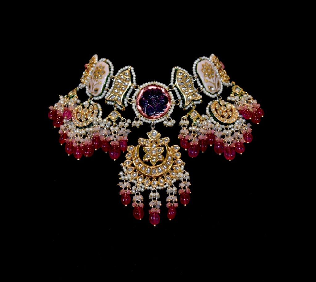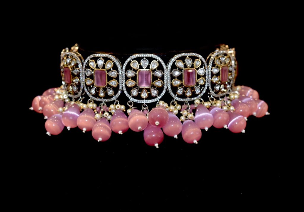 A romantic take on bridal jewellery, this choker blends Victorian diamonds with classic kundan and soft semi-precious pink stones. Ideal for brides who favour elegance and sentiment over excess, it brings a dreamy softness to the neckline. Style it with a pink lehenga for a tonal look or contrast it beautifully against pastel pistachio or ivory ensembles. Its refined sparkle also makes it a beautiful choice for a cocktail party over a classic gown. Buy it HERE.