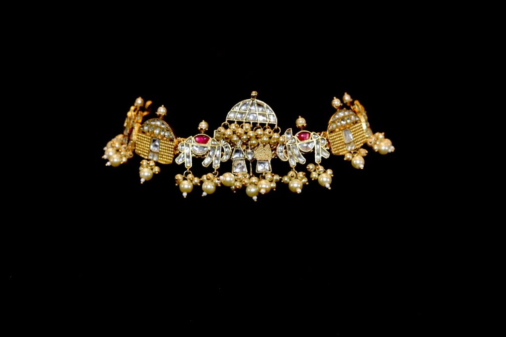 If you’re someone who truly appreciates artisanal detail, The Bharaat Set by Maala London is bound to captivate. A visual delight, it brings the spirit of the baraat alive on the neckline through intricate motifs of elephants and palanquins, crafted in kundan and pearls. Rich in narrative and craftsmanship, it makes a striking choice for an engagement or can be layered with other gold haars for a traditional main-day bridal look. Buy it HERE.