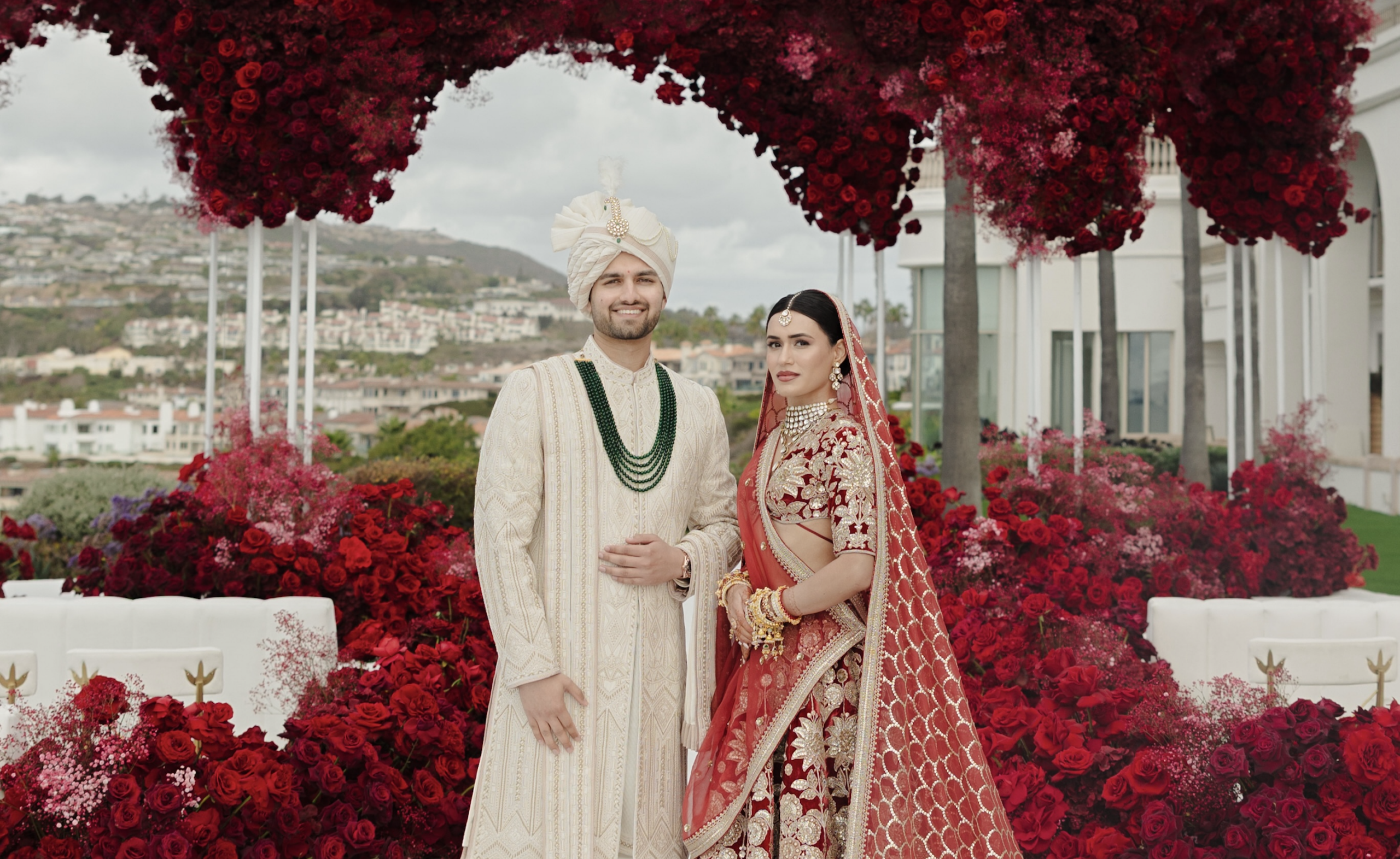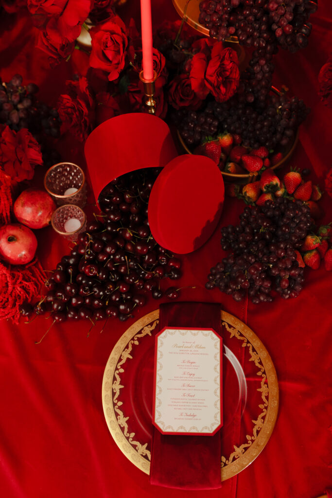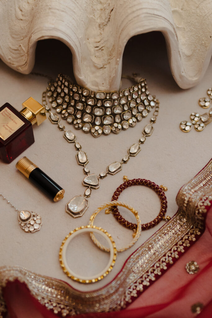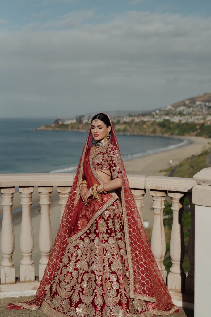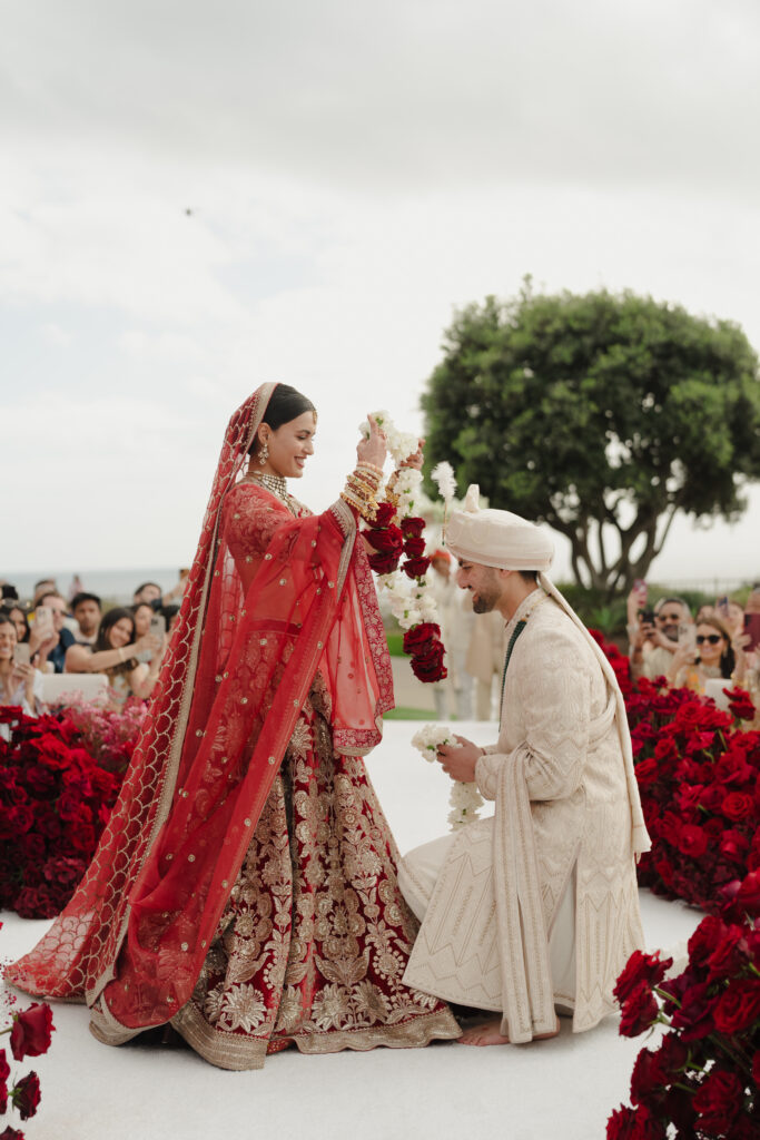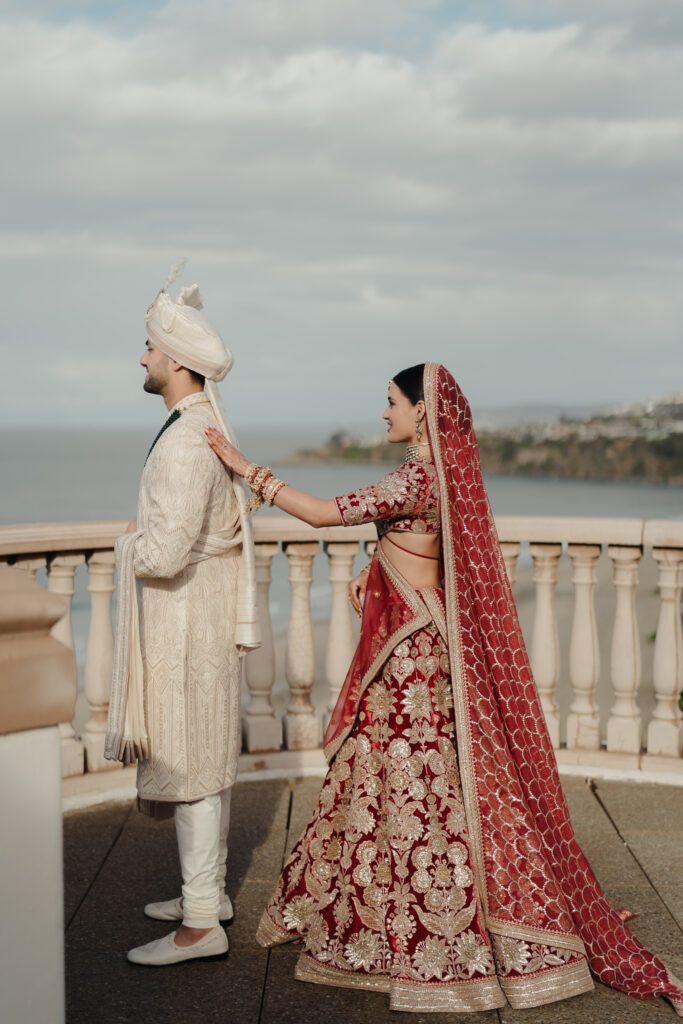 On January 26, beneath a red rose adorned mandap overlooking the ocean, they married. Pearl wore her dream maroon velvet Sabyasachi lehenga, paired with regal polki jewellery from Raniwala 1881. “Even before I met Milan, I knew I would wear a maroon velvet lehenga on my wedding day. And wearing Sabyasachi wasn’t just a dream, but a natural choice. He was the first Indian designer I discovered as a high schooler exploring fashion, and his work has stayed with me ever since. To me, his designs embody the essence of Indian fashion, timeless, rooted in tradition, and rich in craftsmanship. It turned out my mom wore a maroon velvet lehenga for her wedding 28 years ago. My look felt like destiny and a reminder that my sense of style truly comes from her.”