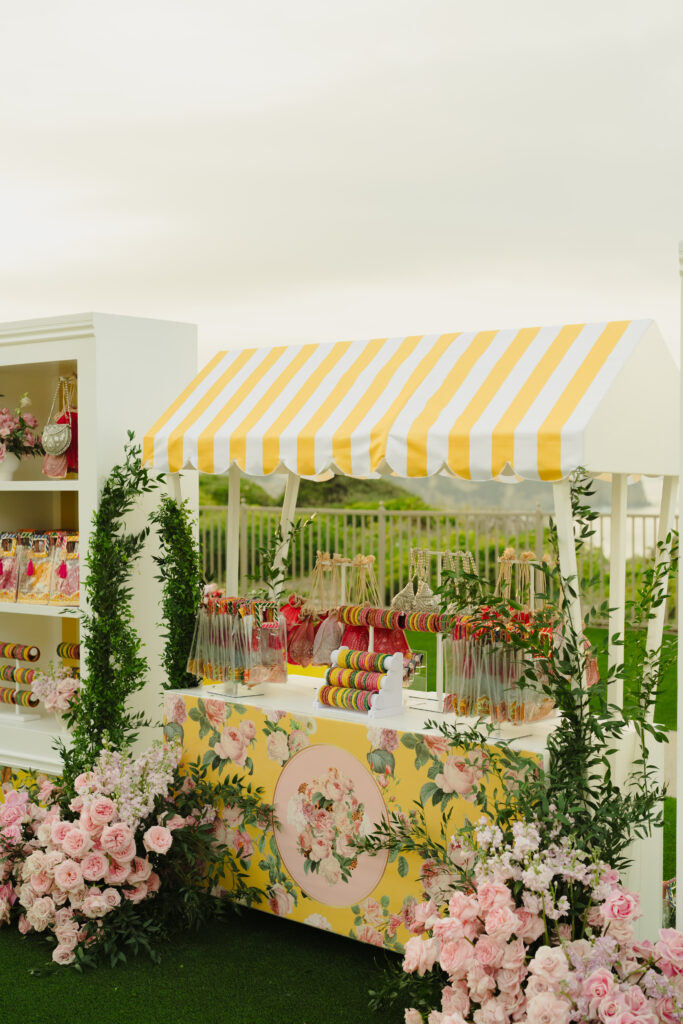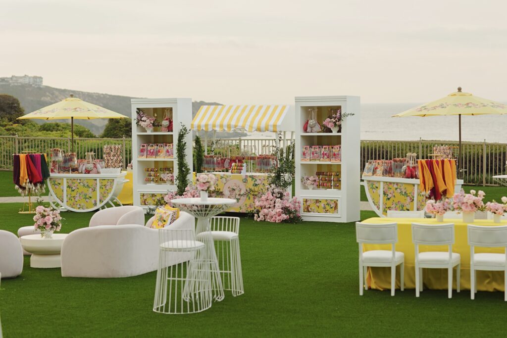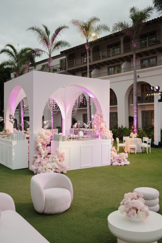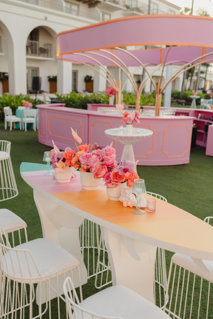That evening, the ‘Louis Vuitton California Dream’ welcome party transformed the lawn into a pastel coastal fantasy. A custom California Dreaming bar, surfboard menus, palm printed linens by Max and Maiden Ink, and entertainers dressed as surfers set the tone.