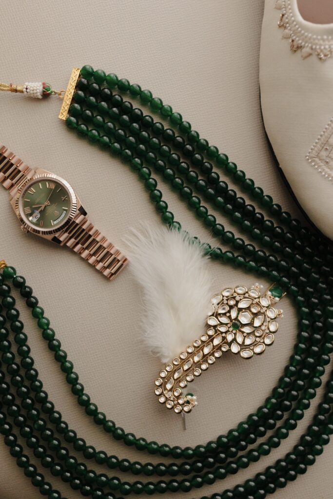 The sangeet embraced a ‘Chanel Dripping in Pearls’ vision. Cascading pearl installations, soft pink florals and immersive performers created a dreamscape. Pearl’s all pearl fish cut lehenga by Manish Malhotra was the perfect pick. Milan wore a sherwani by the couturier and Rolex Daytona.
