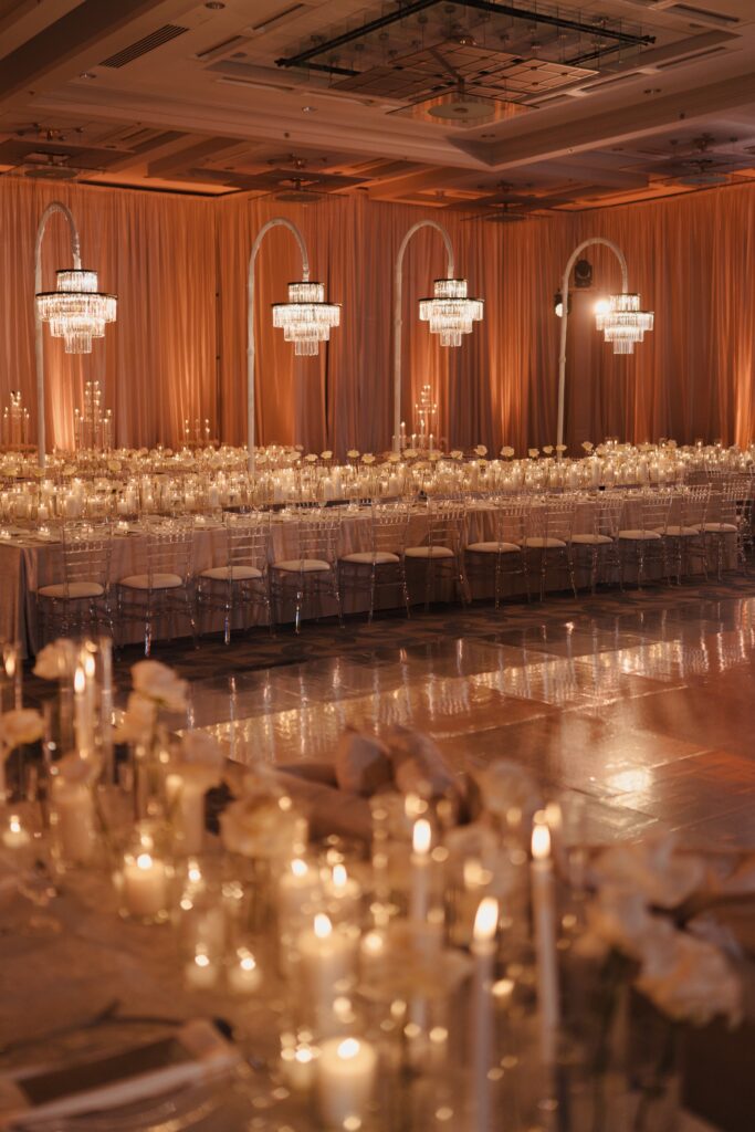 A week later in Atlanta, 800 guests gathered at the Hyatt Regency Atlanta for a Parisian inspired candlelit reception. Pearl wore a runway Rahul Mishra silver lehenga with a dramatic 100 carat emerald necklace by Cohinoor & Co. Milan chose a bespoke Rohit Gandhi and Rahul Khanna tuxedo. Over 4,000 candles illuminated the ballroom as tabla, violin and saxophone blended cultures and sound.