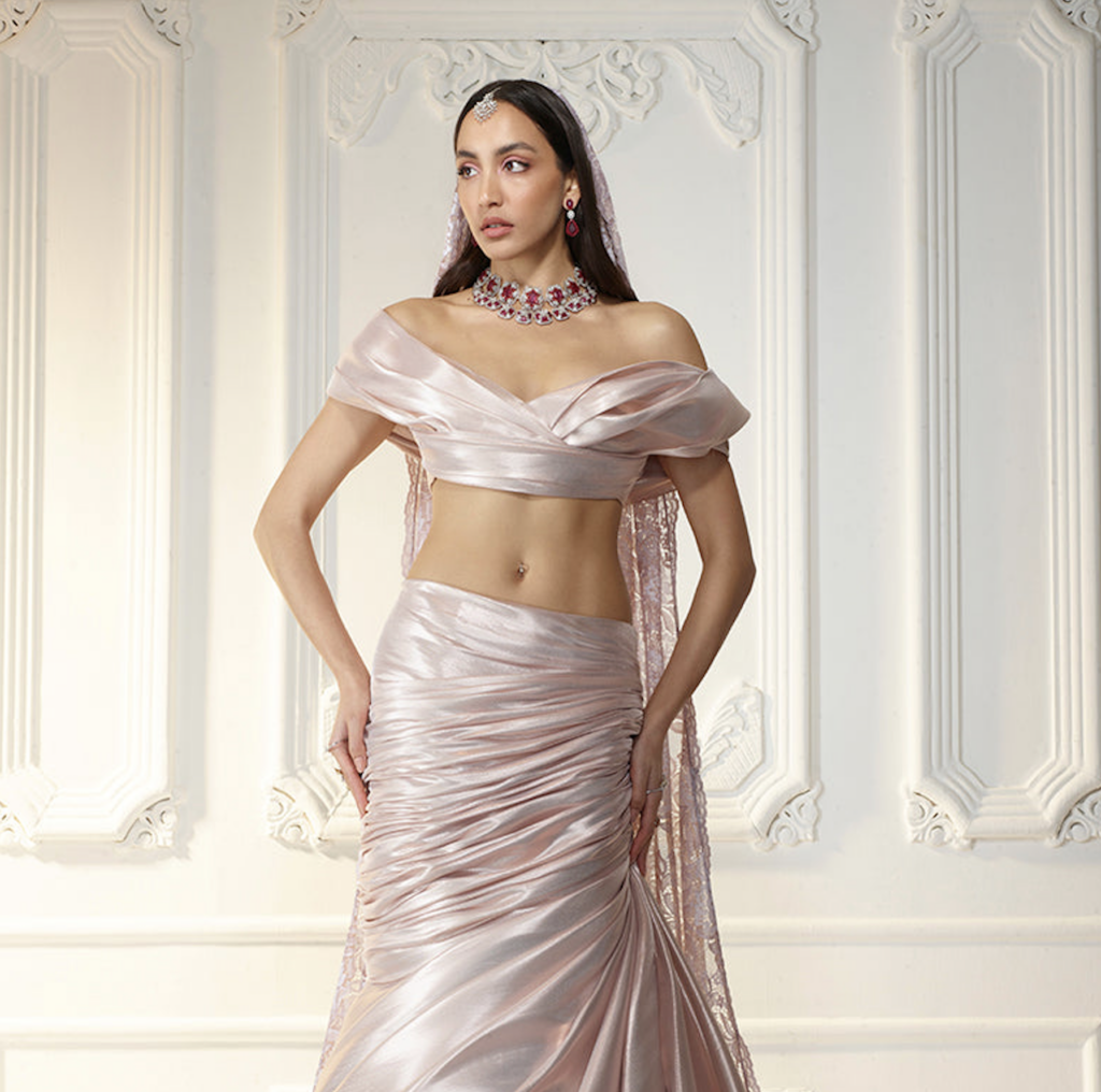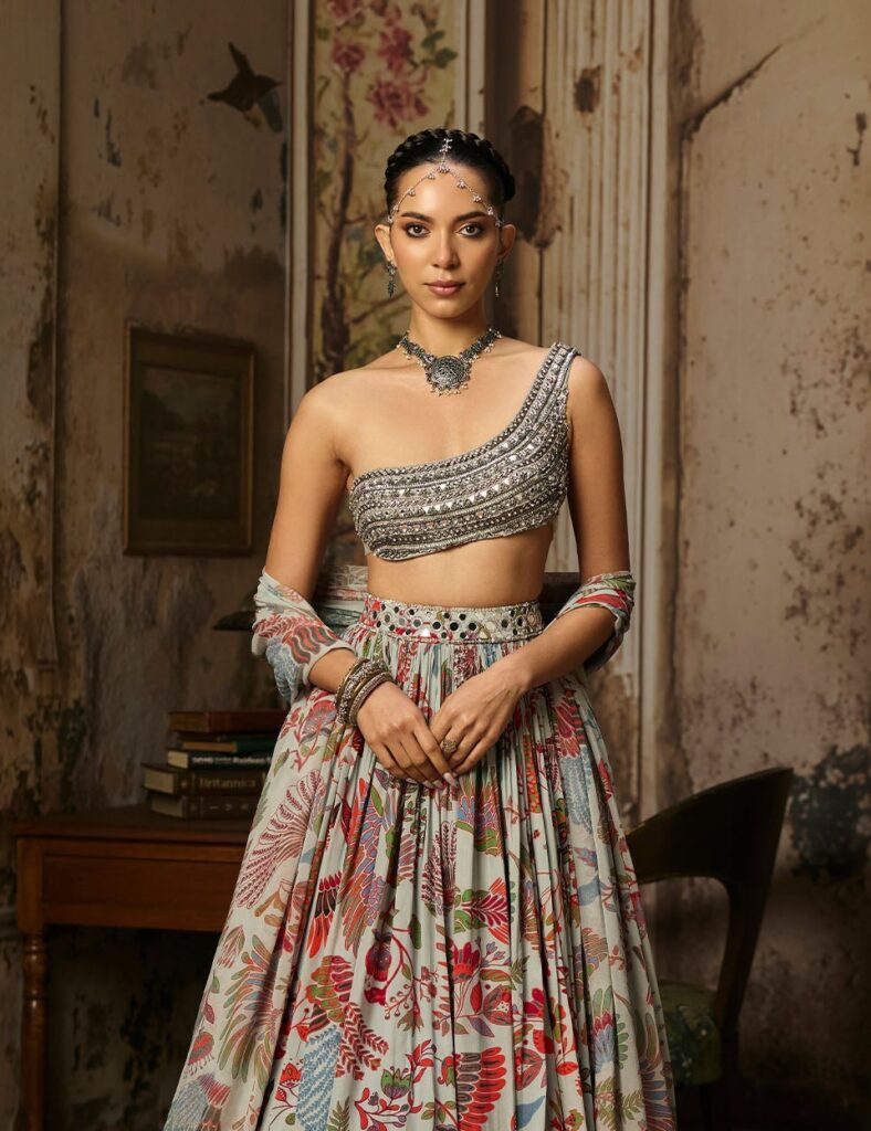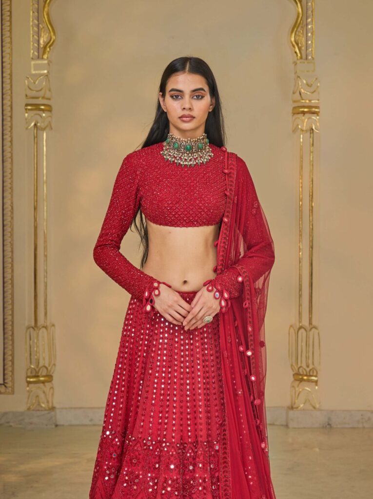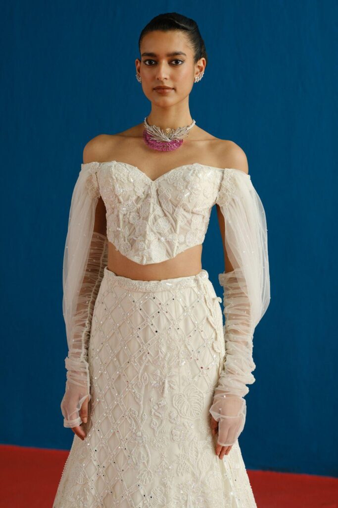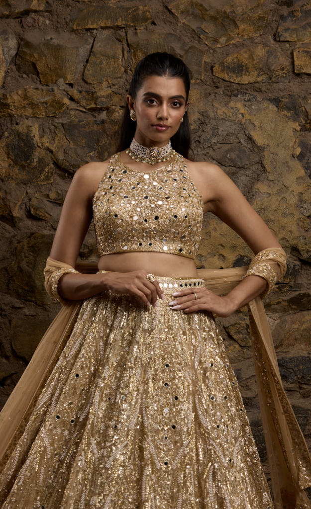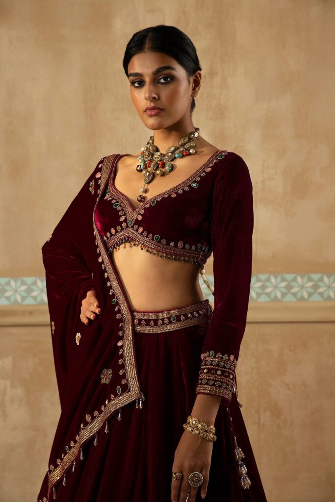 There are a plethora of neckline styles to consider, each with its own personality, posture and point of view. But there are several styles tailored to feel right at home with Indian occasion wear. Be it high neckline that looks as if plucked from a Rajput miniature art or a plunging V that channels old Bollywood glamour, certain silhouettes offer sculptural drama or heritage elegance that complements rich textiles and elaborate jewellery. If you’ve already chosen your heirloom polki set or a modern diamond collar, let that guide the cut. Most designers, even those who don’t offer bespoke ensembles, almost always customise the blouse and its neckline. And the most liberating secret? the skirt and neckline don’t have to align stylistically. A classic lehenga can meet a contemporary neckline and spark magic.