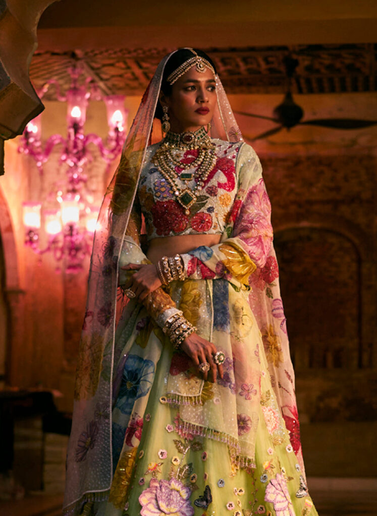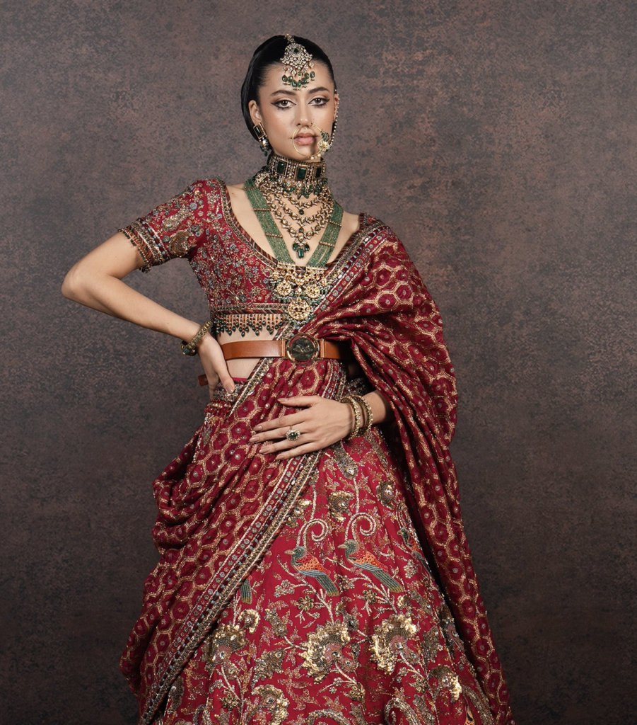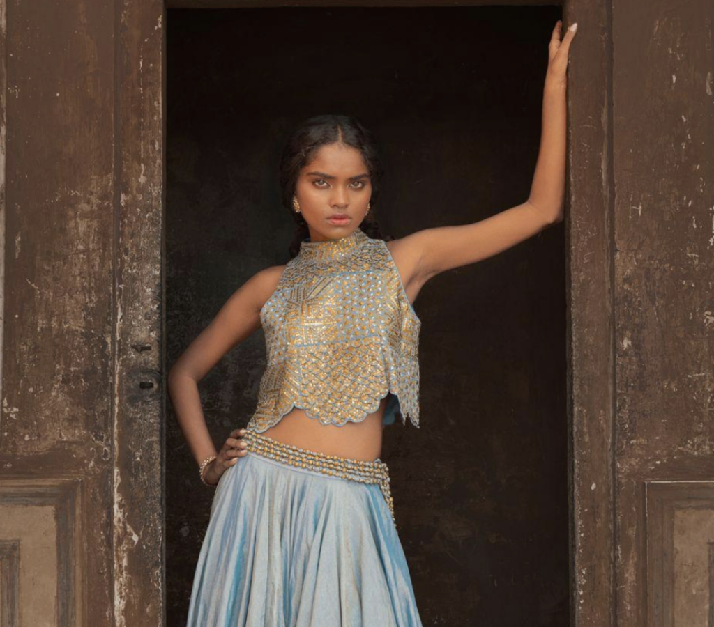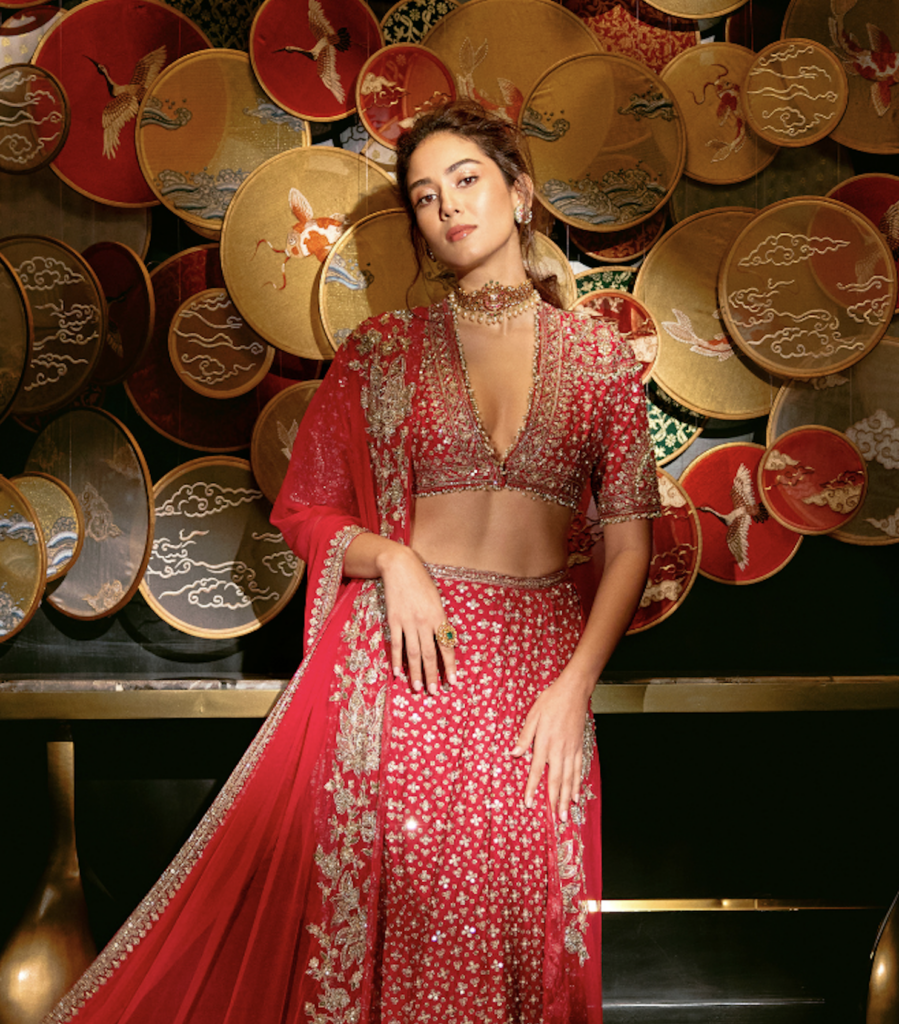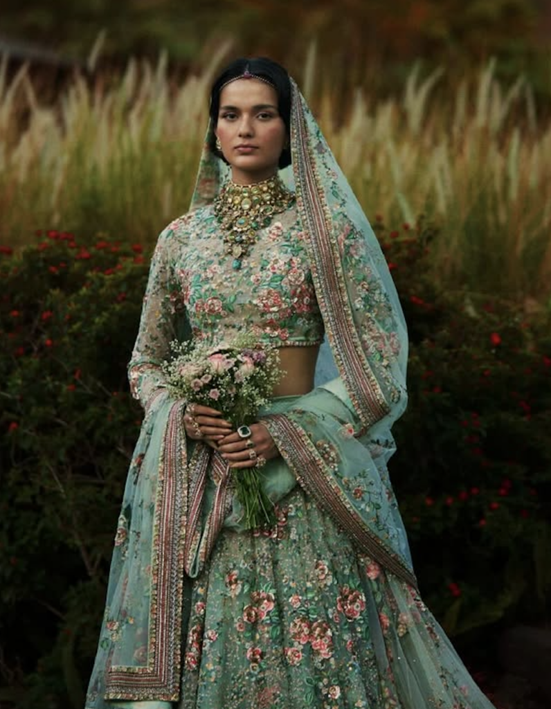 There are a plethora of neckline styles to consider, each with its own personality, posture and point of view. But there are several styles tailored to feel right at home with Indian occasion wear. Be it high neckline that looks as if plucked from a Rajput miniature art or a plunging V that channels old Bollywood glamour, certain silhouettes offer sculptural drama or heritage elegance that complements rich textiles and elaborate jewellery. If you’ve already chosen your heirloom polki set or a modern diamond collar, let that guide the cut. Most designers, even those who don’t offer bespoke ensembles, almost always customise the blouse and its neckline. And the most liberating secret? the skirt and neckline don’t have to align stylistically. A classic lehenga can meet a contemporary neckline and spark magic.