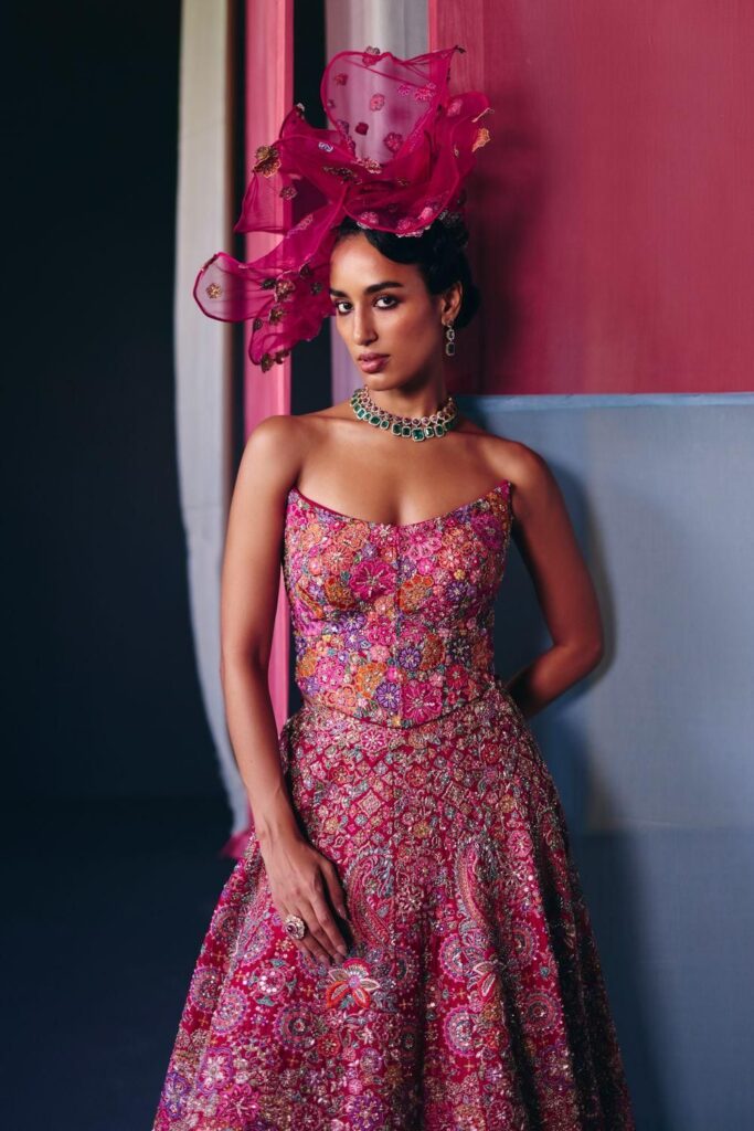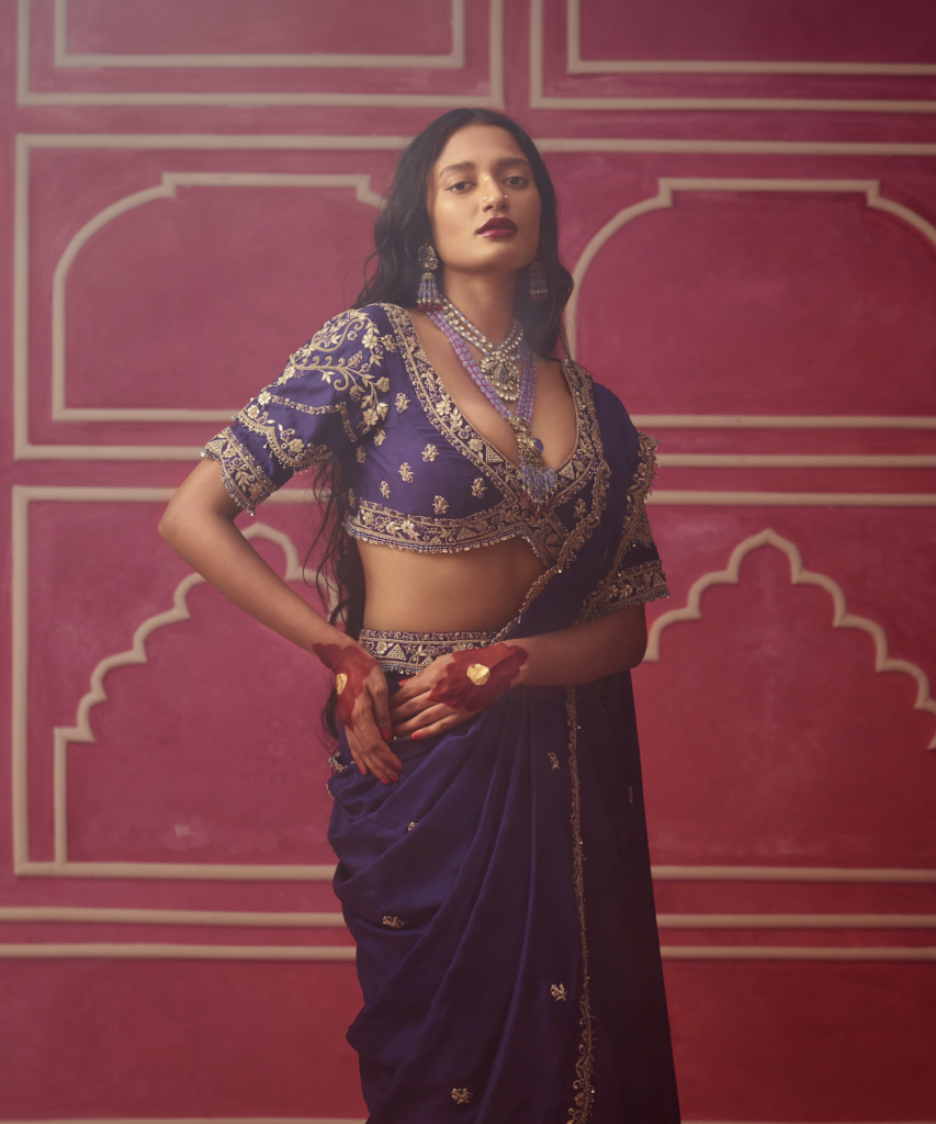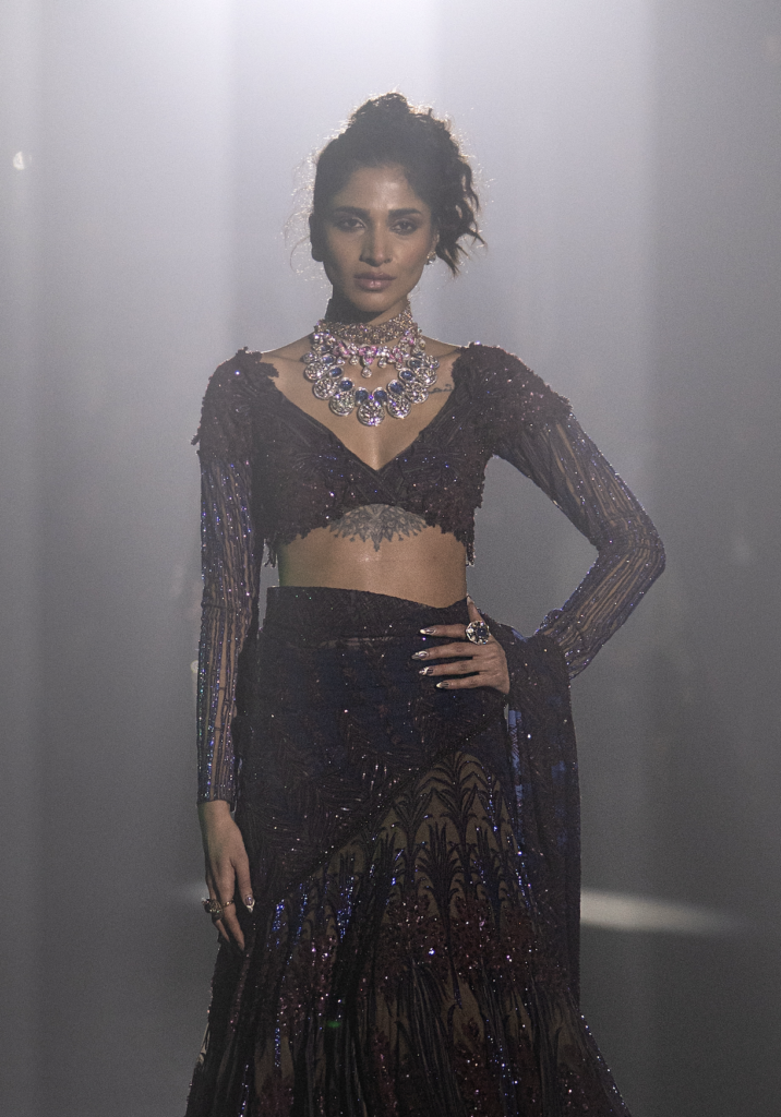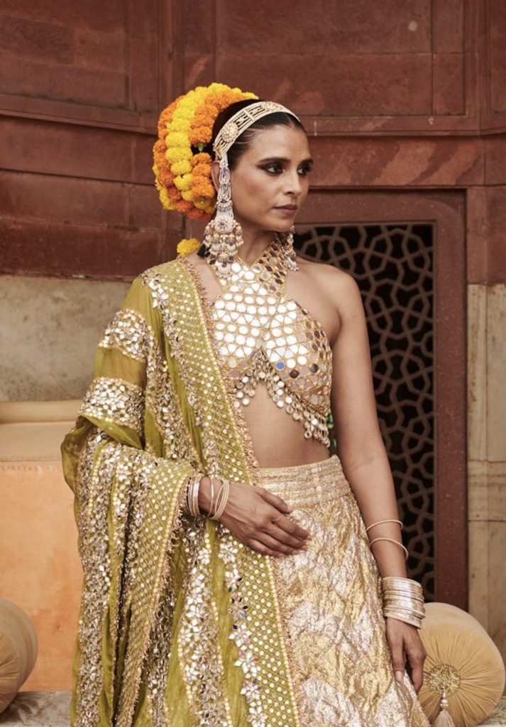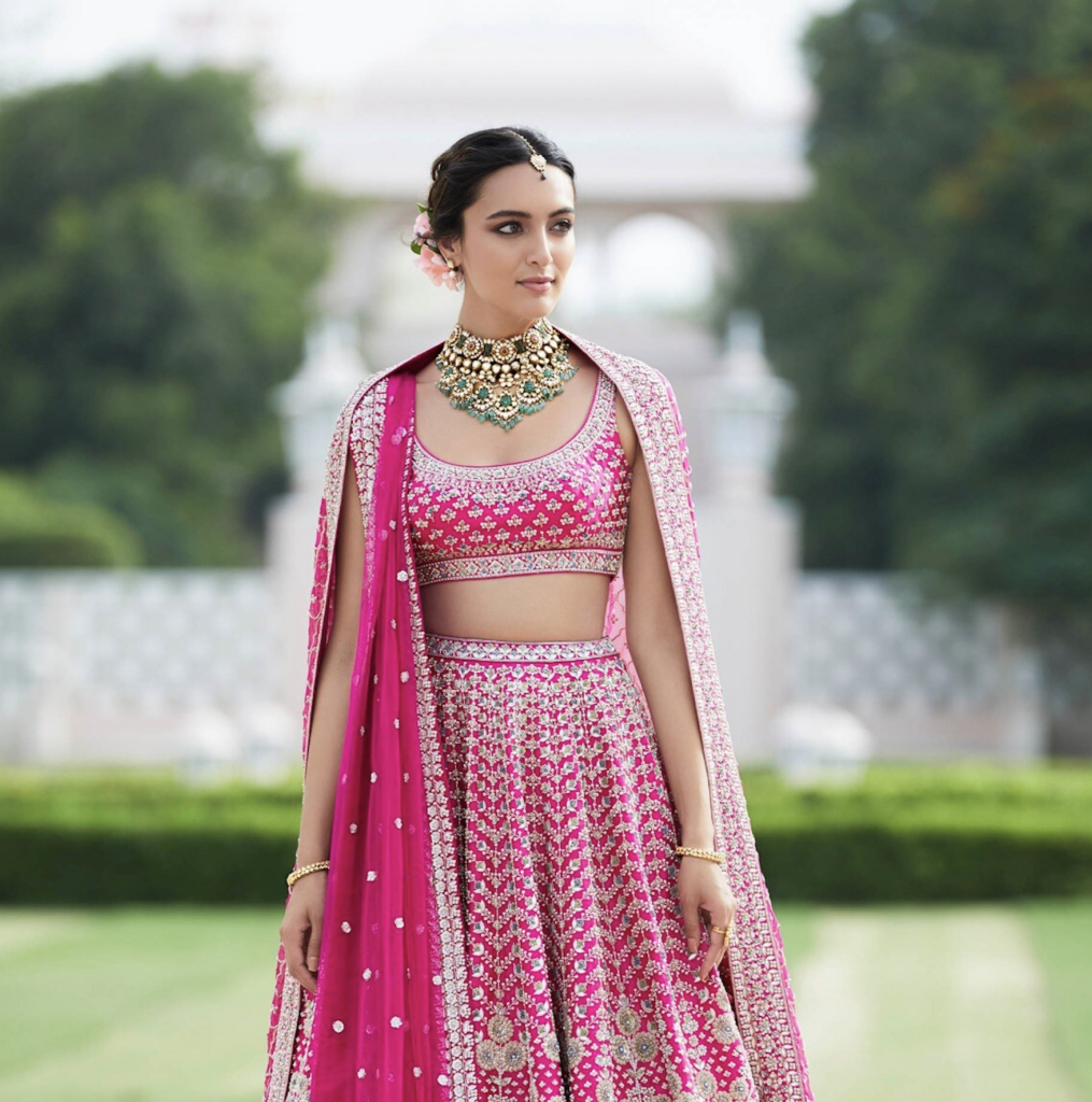 There are a plethora of neckline styles to consider, each with its own personality, posture and point of view. But there are several styles tailored to feel right at home with Indian occasion wear. Be it high neckline that looks as if plucked from a Rajput miniature art or a plunging V that channels old Bollywood glamour, certain silhouettes offer sculptural drama or heritage elegance that complements rich textiles and elaborate jewellery. If you’ve already chosen your heirloom polki set or a modern diamond collar, let that guide the cut. Most designers, even those who don’t offer bespoke ensembles, almost always customise the blouse and its neckline. And the most liberating secret? the skirt and neckline don’t have to align stylistically. A classic lehenga can meet a contemporary neckline and spark magic.