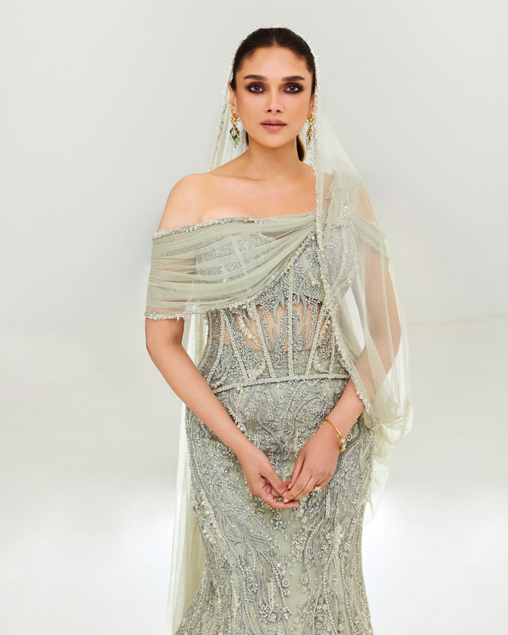 The off-shoulder neckline sits below the shoulders, revealing the collarbones and upper arms. The sensual style has had something of a cultural moment in bridal fashion, and for very good reason. Particularly striking for receptions or cocktail functions, this neckline blends Western red-carpet glamour with Indian bridal grandeur. A swept-back bun or soft side-parted waves heighten its romance. Jewellery styling requires a little thought too. Its strong horizontal line allows you to go minimal with neckpieces. All you need is a choker or chandelier earrings.