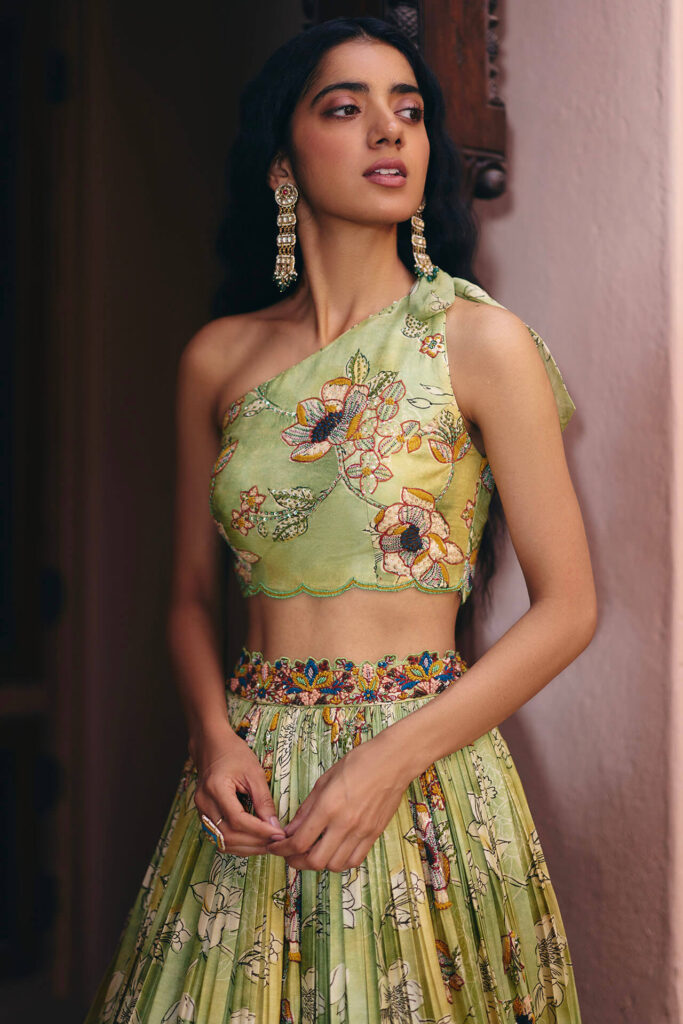 The one-shoulder neckline features a single strap or sleeve, leaving the other shoulder bare. Asymmetry is having a moment, and the one-shoulder blouse is its bridal ambassador. It is one of the more contemporary choices and works particularly well when paired with a flowing lehenga skirt. Keep necklaces minimal, let the neckline breathe, and instead choose bold earrings and a statement maang tikka. Hair swept to the exposed side accentuates the silhouette. It’s fashion-forward and perfect if you want tradition with a twist.